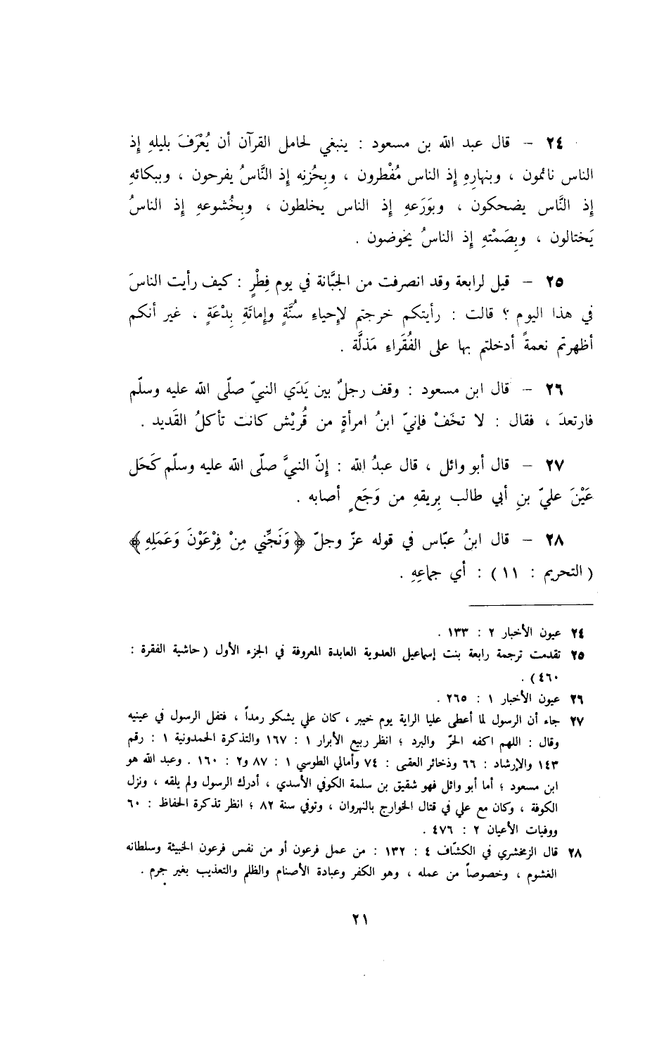 قال عبد الله بن مسعود: ينبغي لحامل القرآن أن يعرف بليله إذ الناس نائمون، وبنهاره إذ الناس مفطرون، وبحزنه إذ الناس يفرحون، وببكائه إذ الناس يضحكون، وبورعه إذ الناس يخلطون، وبخشوعه إذ الناس يختالون، وبصمته إذ الناس يخوضون.