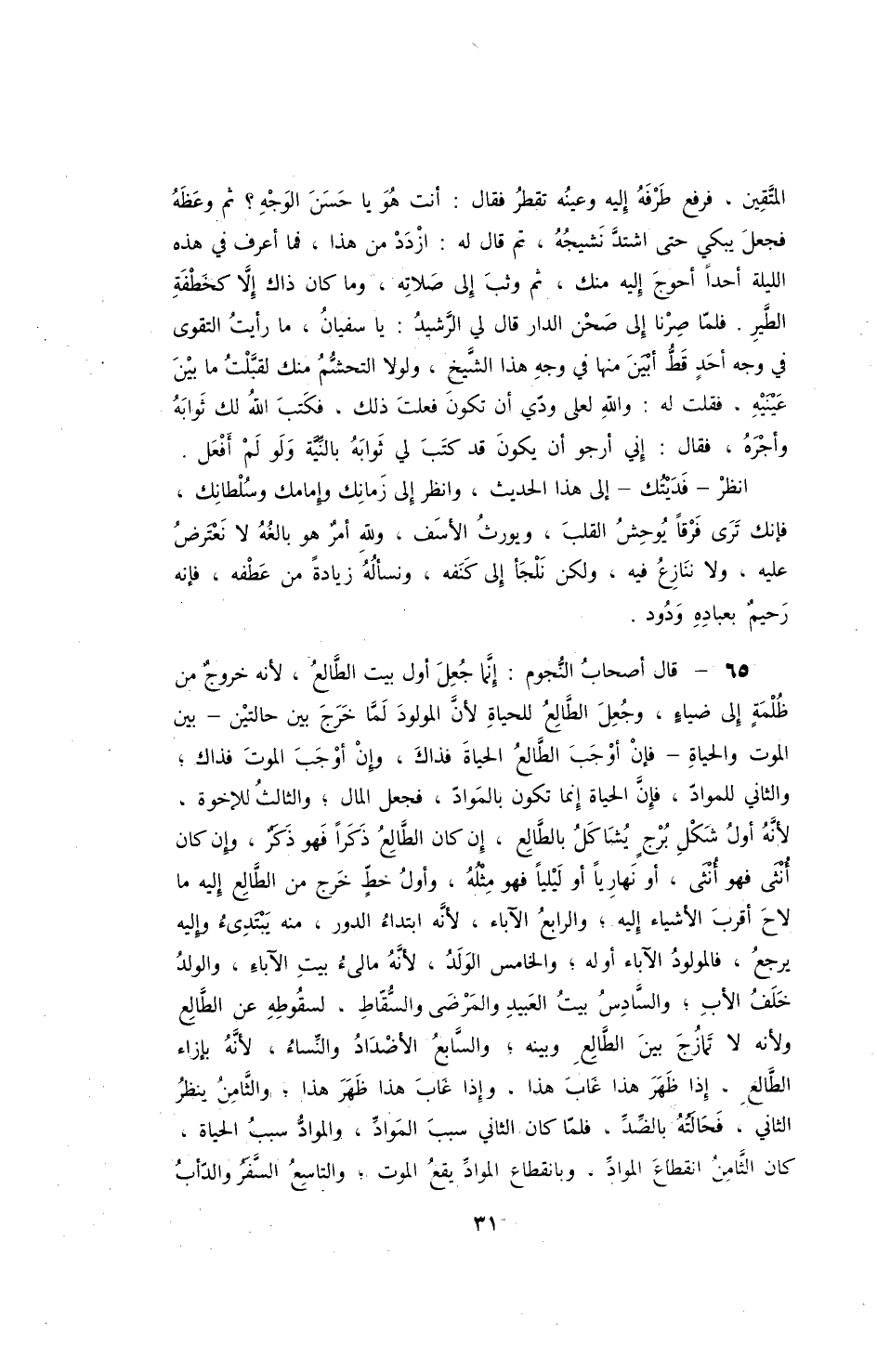 انظر - فديتك - إلى هذا الحديث، وانظر إلى زمانك وإمامك وسلطانك، فإنك ترى فرقاً يوحش القلب، ويورث الأسف، ولله أمر هو بالغه لا نعترض عليه، ولا ننازع فيه، ولكن ناجأ إلى كنفه، ونسأله زيادة من عطفه، فإنه رحيم بعباده ودود.