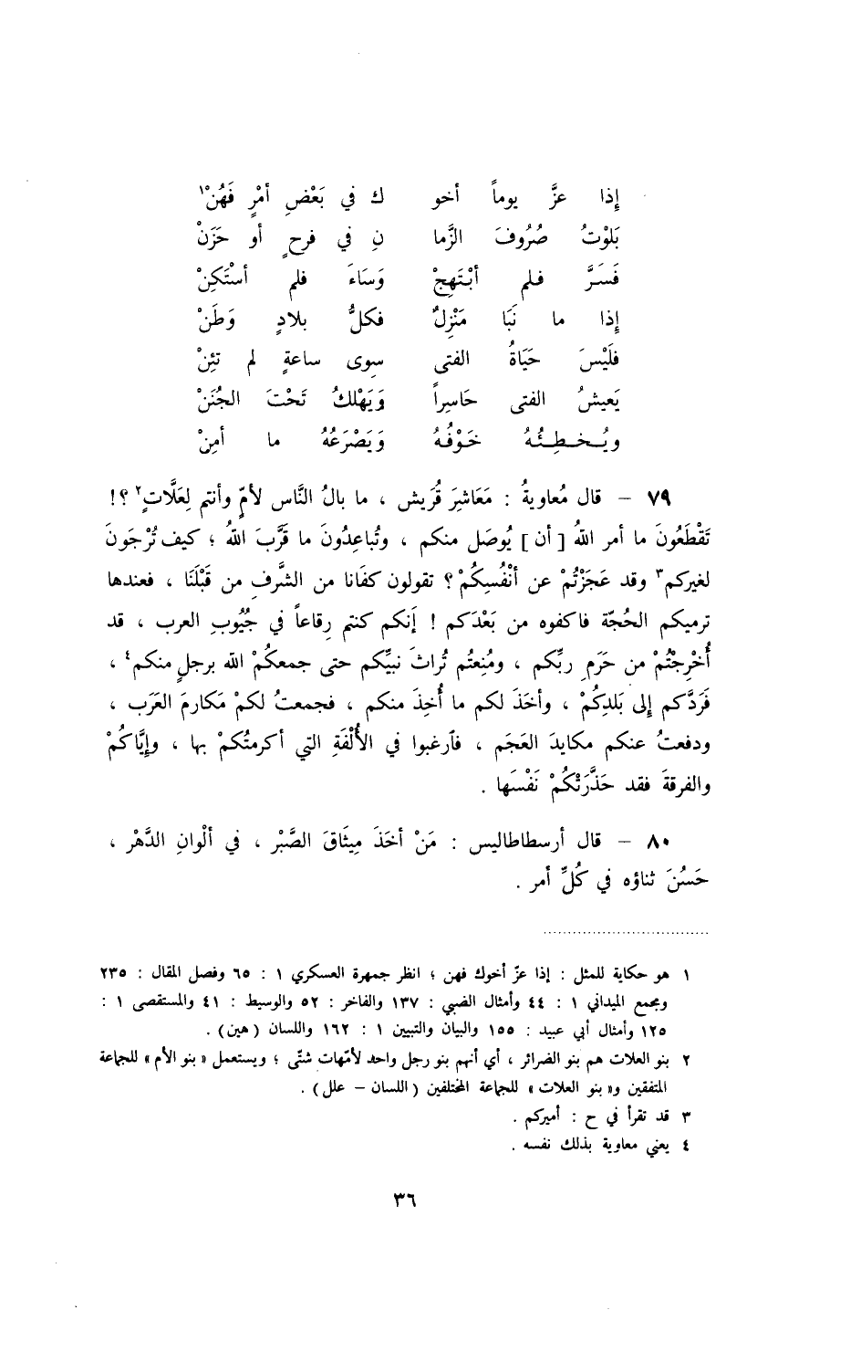 قال معاوية: معاشر قريش، ما بال الناس لأم وأنتم لعلات؟! تقطعون ما أمر الله أن يوصل منكم، وتباعدون ما قرب الله؛ كيف ترجون لغيركم وقد عجزتم عن أنفسكم؟ تقولون كفانا من الشرف من قبلنا، فعندها ترميكم الحجة فاكفوه من بعدكم! إنكم كنتم رقاعاً في جيوب العرب، قد أخرجتم من حرم ربكم، ومنعتم تراث نبيكم حتى جمعكم الله برجل منكم، فردكم إلى بلادكم، وأخذ لكم ما أخذ منكم، فجمعت لكم مكارم العرب، ودفعت عنكم مكايد العجم، فأرغبوا في الألفة التي أكرمتكم بها، وإياكم والفرقة فقد حذرتكم نفسها.