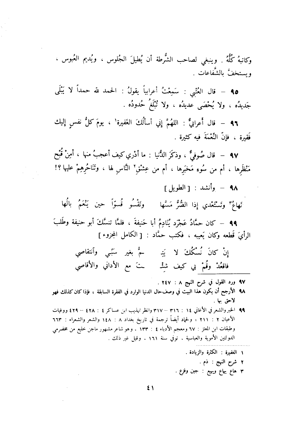 قال العتبي: سمعت أعرابياً يقول: الحمد لله حمداً لا يبلى جديده، ولا يحصى عديده، ولا تبلغ حدوده.