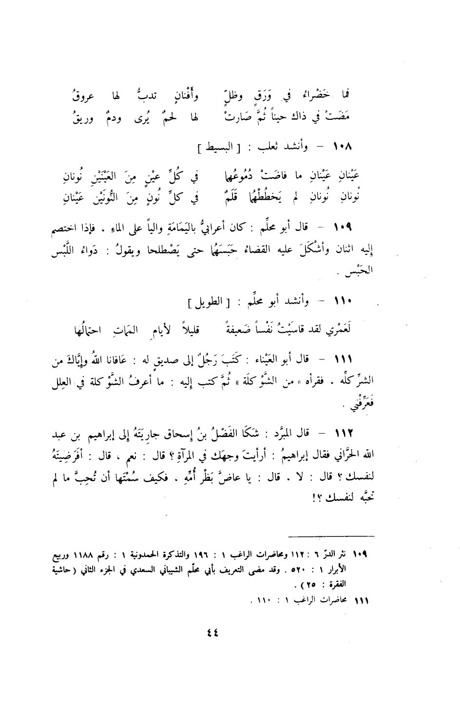 قال المبرد: شكا الفضل بن إسحاق جاريته إلى إبراهيم بن عبد الله الحراني فقال إبراهيم: أرأيت وجهك في المرآة؟ قال: نعم، قال: أفرضيته لنفسك؟ قال: لا، قال: يا عاض بظر أمه، فكيف سمتها أن تحب ما لم تحبه لنفسك؟!