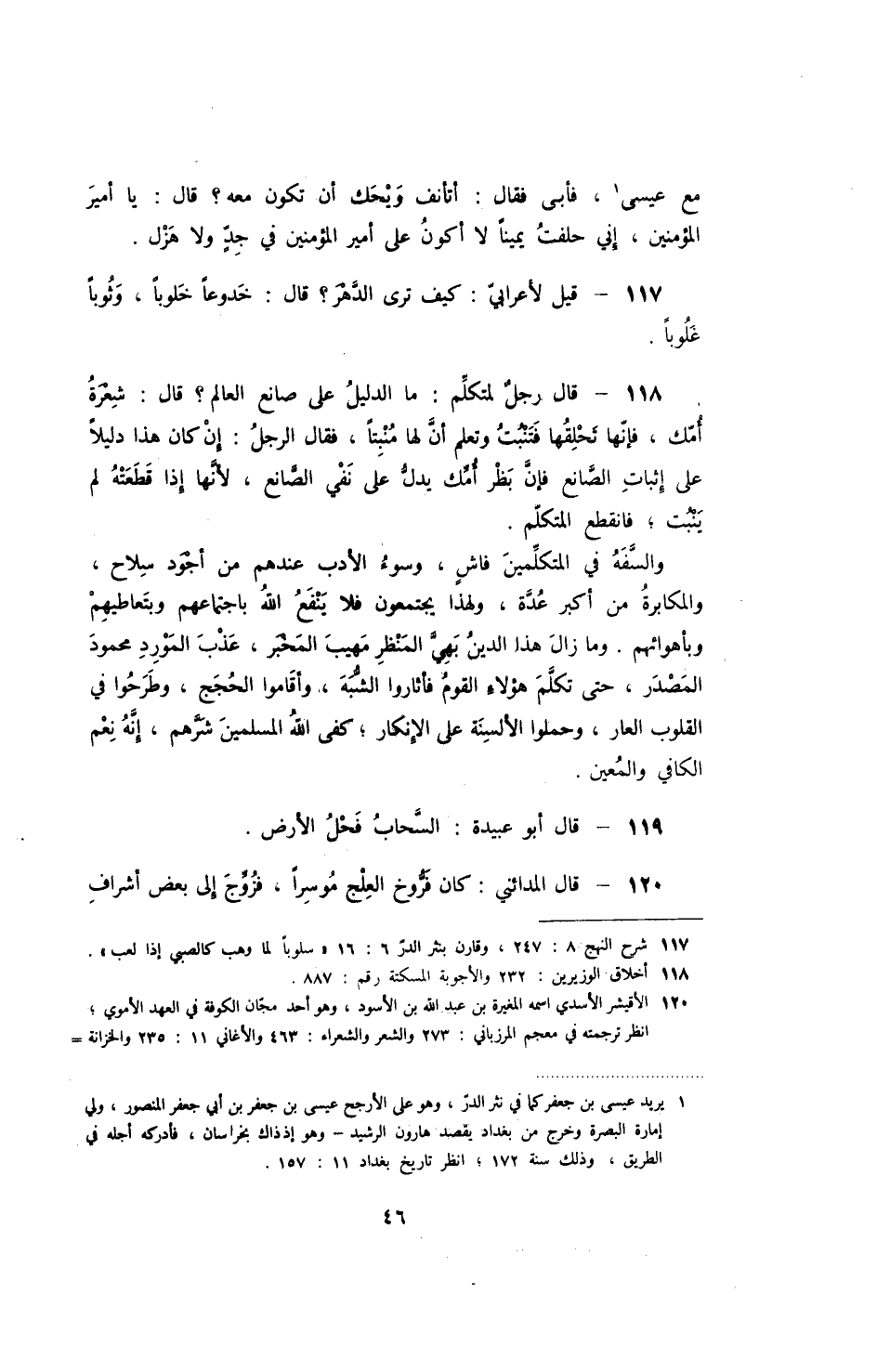 والسفه في المتكلمين فاش، وسوء الأدب عندهم من أجود سلاح، والمكابرة من أكبر عدة، ولهذا يجتمعون فلا ينفع الله باجتماعهم وبتعاطيهم وبأهوائهم. وما زال هذا الدين بهي المنظر مهيب المخبر، عذب المورد محمود المصدر، حتى تكلم هؤلاء القوم فأثاروا الشبه، وأقاموا الحجج، وطرحوا في القلوب العار، وحملوا الألسنة على الإنكار؛ كفى الله المسلمين شرهم، إنه نعم الكافي والمعين.