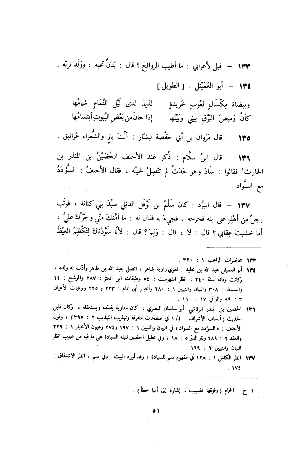 قال ابن سلام: ذكر عند الأحنف الحضين بن المنذر بن الحارث فقالوا: ساد وهو حدث لم تتصل لحيته، فقال الأحنف: السؤدد مع السواد.