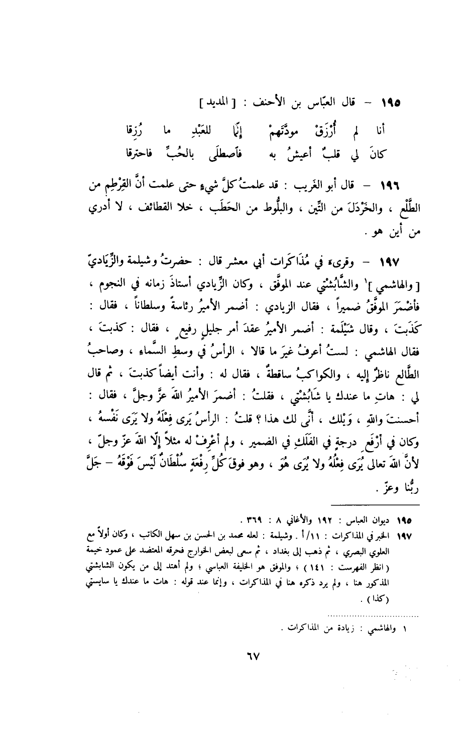 وقرىء في مذاكرات أبي معشر قال: حضرت وشيلمة والزيادي والهاشمي والشابشتي عند الموفق، وكان الزيادي أستاذ زمانه في النجوم، فأضمر الموفق ضميراً، فقال الزيادي: أضمر الأمير رئاسة وسلطاناً، فقال: كذبت، وقال شيلمة: أضمر الأمير عقد أمر جليل رفيع، فقال: كذبت، فقال الهاشمي: لست أعرف غير ما قالا، الرأس في وسط السماء، وصاحب الطالع ناظر إليه، والكواكب ساقطة، فقال له: وأنت أيضاً كذبت، ثم قال لي: هات ما عندك يا شابشتي، فقلت: أضمر الأمير الله عز وجل، فقال: أحسنت والله، ويلك، أنى لك هذا؟ قلت: الرأس يرى فعله ولا يرى نفسه، وكان في أرفع درجة في الفلك في الضمير، ولم أعرف له مثلاً إلا الله عز وجل، لأن الله تعالى يرى فعله ولا يرى هو، وهو فوق كل رفعة سلطان ليس فوقه - جل ربنا وعز.