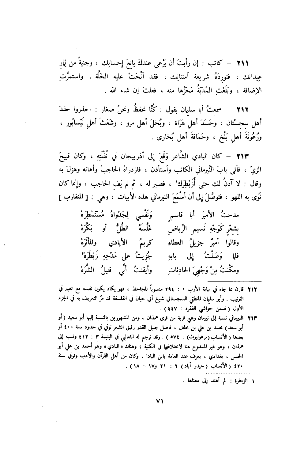 كان البادي الشاعر وقع إل أذربيجان في نقلته، وكان قبيح الزي، فأتى باب النيرماني الكاتب وآستأذن، فازدراه الحاجب وأهانه وهزل به وقال: لا آذن لك حتى أزبطرك، فصبر له، ثم لم يف الحاجب، وإنما كان نوى به اللهو، فتوصل إلى أن أسمع النيرماني هذه الأبيات، وهي: المتقارب
