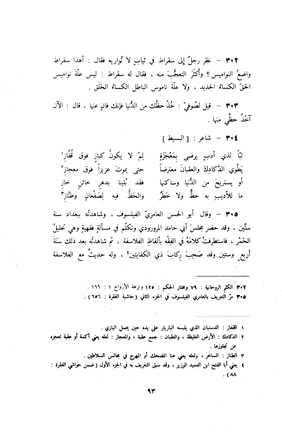 وقال أبو الحسن العامري الفيلسوف، وشاهدته ببغداد سنة ستين، وقد حضر مجلس أبي حامد المروروذي وتكلم في مسألة فقهية وهي تحليل الخمر، فاستطرفت كلامه في الفقه بألفاظ الفلاسفة، ثم شاهدته بعد ذلك سنة أربع وستين وقد صحب ركاب ذي الكفايتين، وله حديث مع الفلاسفة