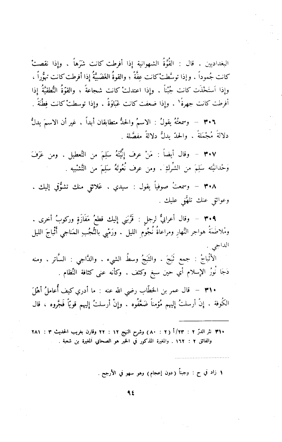البغداديين، قال: القوة الشهوانية إذا أفرطت كانت شرهاً، وإذا نقصت كانت جموداً، وإذا توسطت كانت عفة؛ والقوة الغضبية إذا أفرطت كانت تهوراً، وإذا أستخذت كانت جبناً، وإذا اعتدلت كانت شجاعة؛ والقوة النطقية إذا أفرطت كانت جهرة، وإذا ضعفت كانت غباوة، وإذا توسطت كانت فطنة.