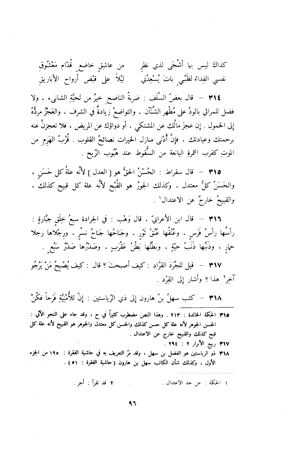 قال بعض السلف: ضربة الناصح خير من تحية الشانئ، ولا فضل للمرائي بالود على مظهر الشنآن، والتواضع زيادة في الشرف، والعجز مرده إلى الخمول. إن عجز مالك عن المشتكي، أو دواؤك عن المريض، فلا تعجزن عنه برحمتك وعيادتك، فإن أدنى منازل الخيرات نصائح القلوب. قرب الهرم من الموت كقرب الثمرة اليانعة من السقوط عند هبوب الريح.