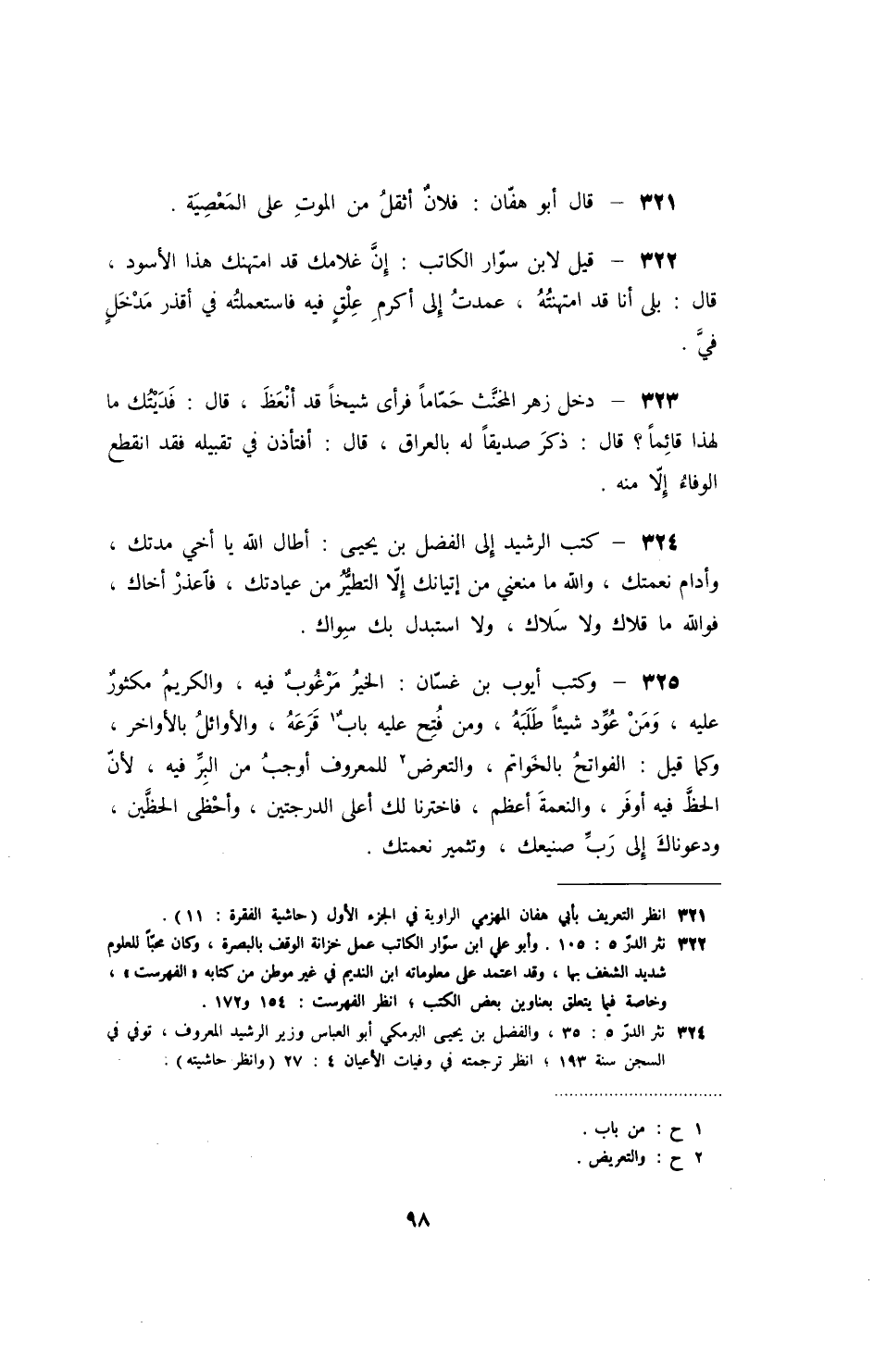 وكتب أيوب بن غسان: الخير مرغوب فيه، والكريم مكثور عليه، ومن عود شيئاً طلبه، ومن فتح عليه باب قرعه، والأوائل بالأواخر، وكما قيل: الفواتح بالخواتم، والتعرض للمعروف أوجب من البر فيه، لأ، الحظ فيه أوفر، والنعمة أعظم، فاخترنا لك أعلى الدرجتين، وأحظى الحظين، ودعوناك إلى رب صنيعك، وتثمير نعمتك.