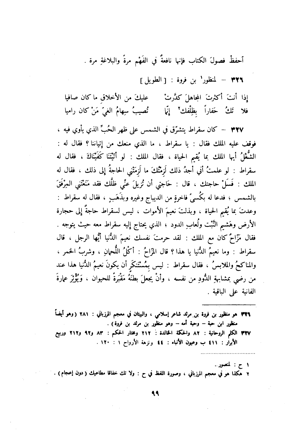 كان سقراط يتشرق في الشمس على ظهر الحب الذي يأوي فيه، فوقف عليه الملك فقالك يا سقراط، ما الذي منعك من إتياننا؟ فقال له: الشغل أيها الملك بما يقيم الحياة، فقال الملك: لو أتيتنا كفيناك، فقال له سقراط: لو علمت أني أجد ذلك لزمتك ما لزمتني الحاجة إلى ذلك، فقال له الملك: فسل حاجتك، قال: حاجتي أن تزيل عني ظلك فقد منعتني المرفق بالشمس؛ فدعا له بكسى فاخرة من الديباج وغيره ويذهب، فقال له سقراط: وعدت بما يقيم الحياة، وبذلت نعيم الأموان، ليس لسقراط حاجة إلى حجارة الأرض وهشيم النبت ولعاب الدود؛ الذي يحتاج إليه سقراط معه حيث يتوجه. فقال مزاح كان مع الملك: لقد حرمت نفسك نعيم الدنيا أيها الرجل، قال سقراط: وما نعيم الدنيا يا هذا؟ قال المزاح: أكل اللحمان، وشرب الخمر، والمناكح والملابس، فقال سقراط: ليس بمستنكر أن يكون نعيم الدنيا هذا عند من رضي بمشابهة الدود من نفسه، وأن سجعل بظنه مقبرة للحيوان، ويؤثر عمارة الفانية على الباقية.
