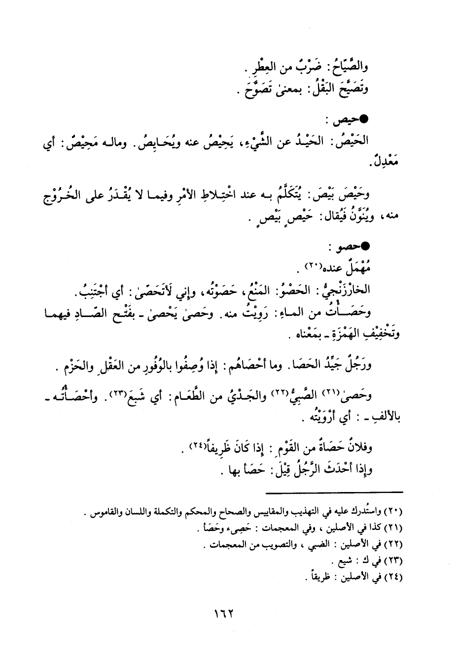 والصَّيّاحُ : ضَرْبٌ من العِطْرِ . وتَصَيَّحَ البَقْلُ : بمعنى تَصَوَّحَ . حيص الحَيْصُ : الحَيْدُ عن الشَّيْءِ . يَحِيْصُ عنه ويُحَايِصُ ، وماله مَحِيْصٌ : أي مَعْدِلٌ . وحَيْصَ بَيْصَ : يُتَكَلَّمُ به عند اخْتِلاطِ الأمْرِ وفيما لا يُقْدَرُ على الخُرُوْج منه ، ويُنَوَّنُ فَيُقال : حَيْصٍ بَيْصٍ . حصو مُهْمَلٌ عنده . الخارزنجي : الحَصْوُ : المَنْعُ ، حَصَوْتُه ، وإِني لَأتَحَصّى : أي أجْتَنِبُ . وحَصَأْتُ من الماءِ : رَوِيْتُ منه ، وحَصى يَحْصى - بفَتْح الصّادِ فيهما وتَخْفِيْفِ الهَمْزَةِ - بمَعْناه . ورَجُلٌ جَيِّدُ الحَصَا ، وما أحْصَاهُم : إذا وُصِفُوا بالوُفُوِر من العَقْلِ والحَزْم . وحَصى الصَّبِيُّ والجَدْيُ من الطَّعَام : أي شَبعَ . وأحْصَأْتُه - بالألفِ - : أي أرْوَيْتُه . وفلانٌ حَصَاةٌ من القَوْمِ : إذا كَانَ ظَرِيفاً . وإذا أحْدَثَ الرَّجُلُ قِيْلَ : حَصَأ بها .