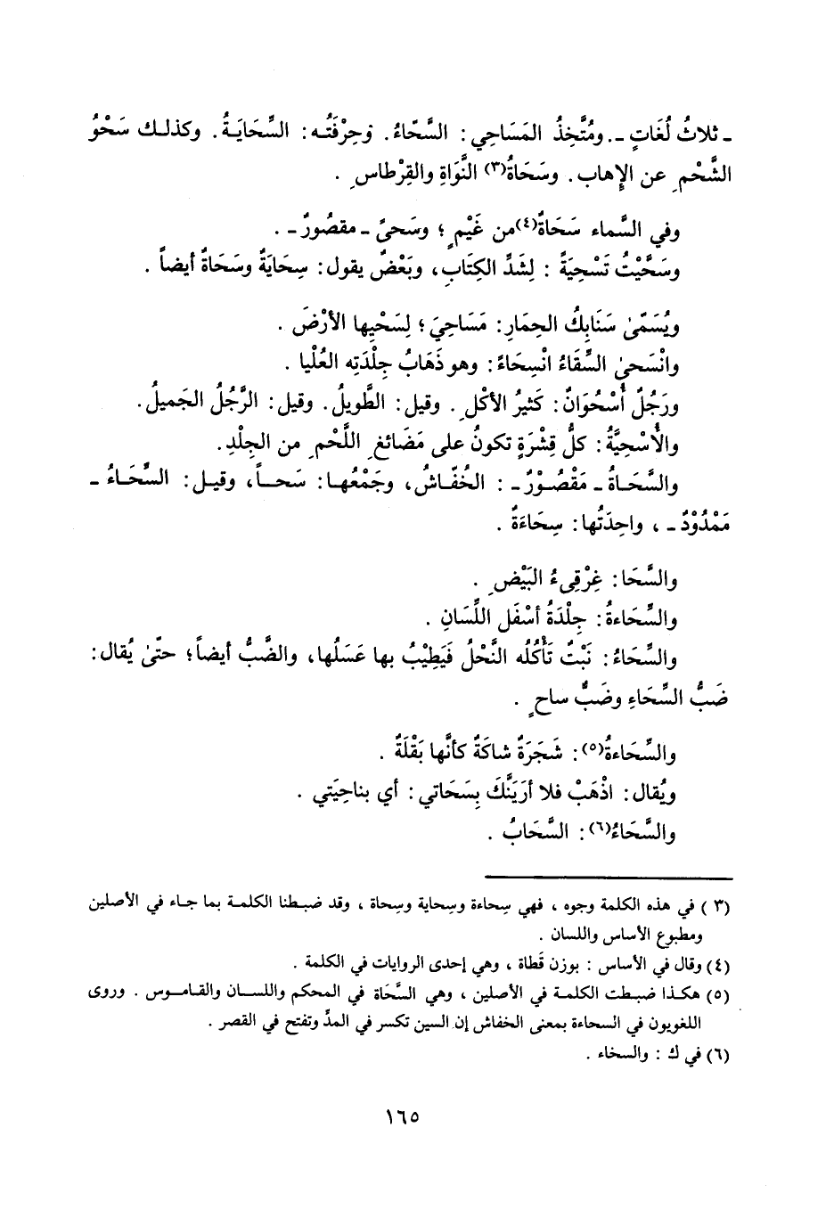 - ثلاثُ لُغَاتٍ - . ومُتَّخِذُ المَسَاحِي : السَّحّاءُ . وحِرْفَتُه : السِّحَايَةُ . وكذلك سَحْوُ الشَّحْمِ عن الإهاب . وسَحَاةُ النَّوَاةِ والقِرْطاسِ . وفي السَّماء سَحَاةٌ ؛ من غَيْمٍ ؛ وسَحىً - مقصُورٌ - . وسَحَّيْتُ تَسْحِيَةً : لِشَدِّ الكِتَابِ ، وبَعْضٌ يقول : سِحَايَةٌ وسَحَاة أيضاً . ويُسَمّى سَنَابِكُ الحِمَارِ : مَسَاحِيَ ؛ لِسَحْيها الأرْضَ . وانْسَحى السِّقَاءُ انْسِحَاءً ؛ وهو ذَهَابُ جِلْدَتِه العُلْيا . ورَجُلٌ أُسْحُوَانٌ : كَثيرُ الأكْلِ . وقيل : الطَّويلُ . وقيل : الرَّجُلُ الجَميلُ . والأُسْحِيَّةُ : كلُّ قِشْرَةٍ تكونُ على مَضَائغِ اللَّحْمِ من الجِلْدِ . والسَّحَاةُ - مَقْصُوْرٌ - : الخُفّاشُ ، وجَمْعُها : سَحاً ، وقيل : السِّحَاءُ - مَمْدُوْدٌ - ، واحِدَتُها : سِحَاءَةٌ . والسَّحَا : غِرْقِيءُ البَيْضِ . والسِّحَاءةُ : جِلْدَةُ أسْفَل اللِّسَانِ . والسِّحَاءُ : نَبْتٌ تَأْكُلُه النَّحْلُ فَيَطِيْبُ بها عَسَلُها ، والضَّبُّ أيضاً ؛ حتّى يُقال : ضَبُّ السِّحَاءِ وضَبٌّ ساحٍ . والسِّحَاءةُ : شَجَرَةٌ شاكَةٌ كأنَّها بَقْلَةٌ . ويقال : اذْهَبْ فلا أرْيَنَّكَ بِسَحَاتي : أي بناحِيَتي . والسَّحَاءُ : السَّحَابُ .