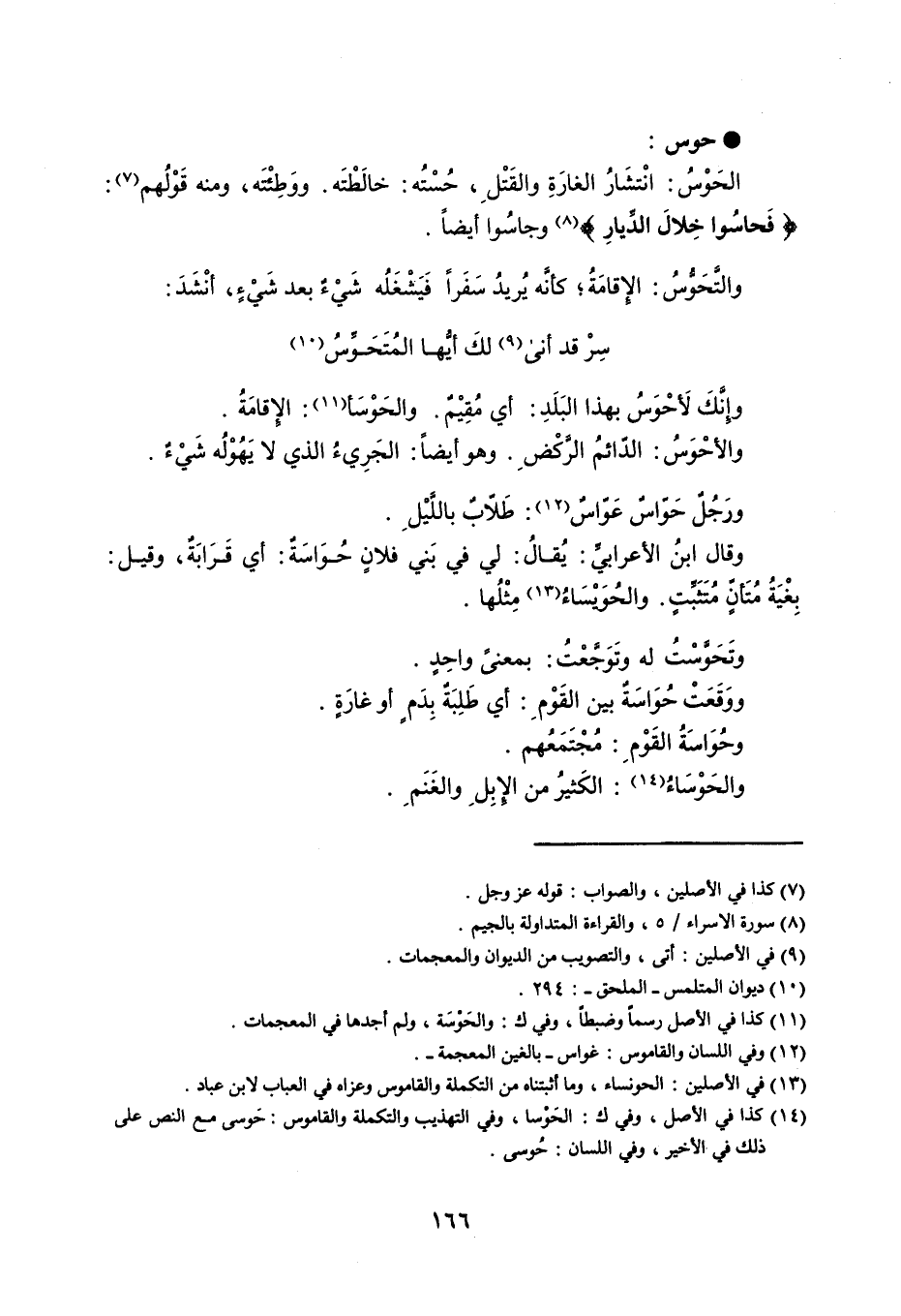 حوس الحَوْسُ : انْتشَارُ الغارَةِ والقَتْلِ ، حُسْتُه : خالَطْتَه . ووَطْئْتَه ، ومنه قولهم : ' فَحاسُوا خِلالَ الدِّيارِ ' وجاسُوا أيضاً . والتَّحَوُّسُ : الإقامَةُ ؛ كأنَّه يُريدُ سَفَراً فَيَشْغَلُه شَيْءٌ بعد شَيْءٍ ، أنشد : سِرْ قد أنى لكَ أيُّها المُتَحَوِّسُ وإنَّكَ لَأحْوَسُ بهذا البَلَدِ : أي مُقِيْمٌ . والحَوْسَأ : الإِقامَةُ . والأحْوَسُ : الدّائمُ الرَّكْضِ . وهو أيضاً : الجَرِيءُ الذي لا يَهُوْلُه شَيْءٌ . ورَجُلٌ حَوّاسٌ عَوّاسٌ : طَلاّبٌ باللَّيْلِ . وقال ابن الأعرابي : يقال : لي في بَني فلانٍ حُوَاسَةٌ : أي قَرَابَةٌ ، وقيل : بِغْيَةُ مُتَأنٍّ مُتَثَبِّتٍ . والحُوَيْسَاءُ مِثْلُها . وتَحَوَّسْتُ له وتَوَجَّعْتُ : بمعنىً واحِدٍ . ووَقَعَتْ حُوَاسَةٌ بين القَوْمِ : أي طَلِبَةٌ بِدَمٍ أو غارَةٍ . وحُوَاسَةُ القَوْمِ : مُجْتَمَعُهم . والحَوْسَاءُ : الكَثيرُ من الإبِلِ والغَنَمِ .