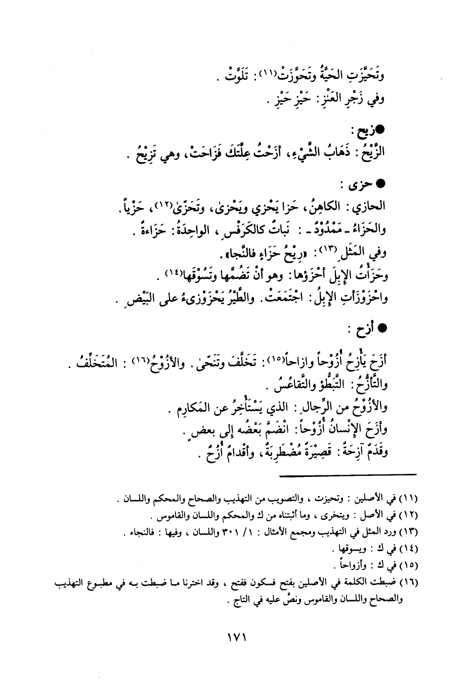 وتَحَيَّزَتِ الحَيَّةُ وتَحَوَّزَتْ : تَلَوَّتْ . وفي زَجْرِ العَنْزِ : حَيْزِ حَيْزِ . زيح الزَّيْحُ : ذَهَابُ الشَّيْءِ ؛ أزَحْتُ عِلَّتَكَ فَزَاحَتْ ، وهي تَزِيْحُ . حزى الحازي : الكاهِنُ ، حَزا يَحْزي ويَحْزى ، وتَحَزّى ، حَزْياً . والحَزَاءُ - مَمْدُوْدٌ - : نَباتٌ كالكَرَفْسِ ، الواحِدَةُ : حَزَاءةٌ . وفي المَثَلِ : رِيْحُ حَزَاءٍ فالنَّجا ' . وحَزَأْتُ الإبِلَ أحْزَؤها : وهو أنْ تَضُمَّها وتَسُوْقَها . واحْزَوْزَأتِ الإبِلُ : اجْتَمَعَتْ . والطَّيْرُ يَحْزَوْزىءُ على البَيْضِ . أزح أزَحَ يَأْزِوُح أُزُوْحاً وازاحاً : تَخَلَّفَ وتَنَحى . والأزُوْحُ : المُتَخَلِّفُ . والتَّأزُّحُ : التَّبَطُّؤ والتَّقاعُسُ . والأزُوْحُ من الرِّجالِ : الذي يَسَْتْأِخرُ عن المَكارِم . وأزَحَ الإنسان أُزُوْحاً : انْضَمَّ بَعْضُه إلى بعضٍ . وقَدَمٌ آزِحَةٌ : قَصِيْرَةٌ مُضْطَرِبَةٌ ، وأقْدام أُزُحٌ .