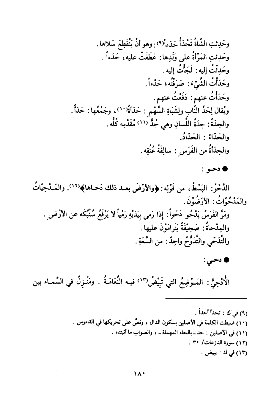وحَدِئتِ الشّاةُ تَحْدَأ حَدَءاً : وهو أنْ يَنْقَطِعَ سَلاها . وحَدِئتِ المَرْأةُ على وَلَدِها : عَطَفَتْ عليه ، حَدَءاً . وحَدِئْتُ إليه : لَجَأْتُ إليه . وحَدَأْت الشَّيْءَ : صَرَفْتُه ؛ حَدْءاً . وحَدَأْتُ عنهم : دَفَعْتُ عنهم . ويُقال لِحَدِّ النّابِ ولِشَبَاةِ السَّهْمِ : حَدَأةٌ ، وجَمْعُها : حَدَأٌ . والحِدَةُ : حِدَةُ اللِّسانِ وهي جُدُّ مُقَدَّمِه كُلُّه . والحدّاء : الحَدّادُ . والحِدَأةُ من الفَرَسِ : سالِفَةُ عُنُقِه . دحو الدَّحْوُ : البَسْطُ ، من قوله : ' والأرْضَ بعد ذلك دَحاها ' . والمَدْحِيّاتُ والمَدْحُوّاتُ : الأرَضُوْنَ . ومَرَّ الفَرَسُ يَدْحُو دَحْواً : إذا رَمى بِيَدَيْهِ رَمْياً لا يَرْفَعُ سُنْبُكَه عن الأرْضِ . والمِدْحاةُ : صَحِيْفَةٌ يَتَرامَوْنَ عليها . والتَّدَحّي والتَّدَوُّحُ واحِدٌ : من السَّعَةِ . دحي الأُدْحِيُّ : المَوْضِعُ التي تَبْيْضُ فيه النَّعَامَةُ . ومَنْزِلٌ في السَّماء بين