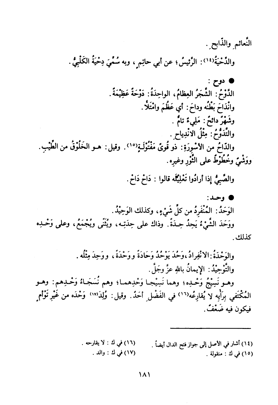 النَّعائمِ والذّابحِ . والدِّحْيَةُ : الرَّئيسُ ؛ عن أبي حاتِمٍ ، وبه سُمِّيَ دِحْيَةُ الكَلْبِيُّ . دوح الدَّوْحُ : الشَّجَرُ العِظامُ ، الواحِدَةُ : دَوْحَةٌ عَظِيْمَةٌ . وانْدَاحَ بَطْنُه وداحَ : أي عَظُمَ وامْتَلأ . وشَهْرٌ دائح : مَلِيءٌ تامٌّ . والتَّدَوُّحُ : : مِثْلُ الإنْدِياحِ . والدّاحُ من الأسْوِرَةِ : ذو قُوىً مَفْتُوْلَةٍ . وقيل : هو الخَلُوْقُ من الطِّيْبِ . ووَشْيٌ وخُطُوْطٌ على الثَّوْرِ وغيرِه . والصَّبِيُّ إذا أرادُوا تَعْلِيْلَه قالوا : دَاحْ دَاحْ . وحد الوَحَدُ : المُنْفَرِدُ من كلِّ َشْيءٍ ، وكذلك الوَحِيْدُ . ووَحَدَ الشَّيْءُ يَحِدُ حِدَةً . وذلك على حِدَتِه ، ويُثَنّي ويُجْمَعُ ، وعلى وَحْدِه كذلك . والوَحْدَةُ : الإنْفِرادُ ، وَحُدَ يَوْحُدُ وَحَادَةً ووَحْدَةً ، ووَحِدَ مِثْلُه . والتَّوْحِيْدُ : الإيمانُ باللهِ عزَّ وجَلَّ . وهو نَسِيْجُ وَحْدِه ؛ وهما نَسِيْجا وَحْدِهما ؛ وهم نُسَجَاءُ وَحْدِهم : وهو المُكْتًفي برَأيْهِ لا يُقارِعُه في الفَضْلِ أحَدٌ . وقيل : وُلِدَ وَحْدَه من غَيْرِ تَوْأمٍ فيكون فيه ضَعْفٌ .