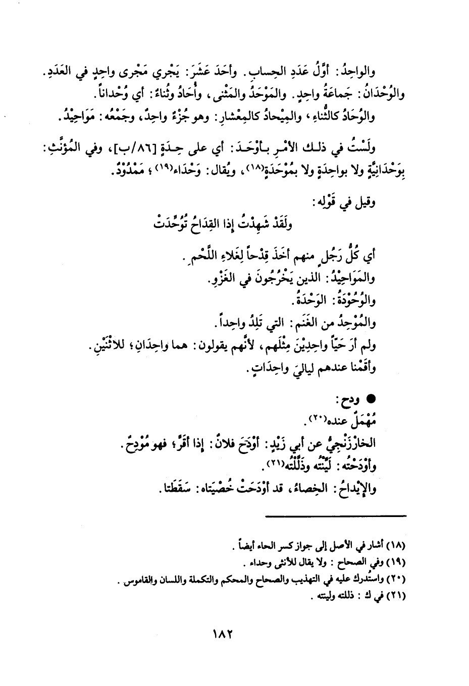 والواحِدُ : أوَّلُ عَدَدِ الحِسابِ ، وأحَدَ عَشَرَ : يَجْري مَجْرى واحِدٍ في العَدَدِ . والوُحْدَانُ : جَماعَةُ واحِدٍ ، والمَوْحَدُ والمَثْنى ، وأُحَادُ وثُناءٌ : أي وُحْداناً . والوُحَادُ كالثُّناءِ ، والمِيْحادُ كالمِعْشارِ : وهو جُزْءٌ واحِدٌ ، وجَمْعُه : مَوَاحِيْدُ . ولَسْتُ في ذلك الأمْرِ بأوْحَدَ : أي على حِدَةٍ ، وفي المُؤنَّثِ : بِوَحْدَاِنَّيةٍ ولا بواحِدَةٍ ولا بمُوْحَدَةٍ ، ويقال : وَحْدَاء ؛ مَمْدُوْدٌ . وقيل في قوله : ولَقَدْ شَهِدْتُ إذا القِدَاحُ تُوُحِّدَتْ أي كُلُّ رَجُلٍ منهم أخَذَ قِدْحاً لِغَلاءِ اللَّحْمِ . والمَوَاحِيْدُ : الذين يَخْرُجُونَ في الغَزْوِ . والوُحُوْدَةُ : الوَحْدَةُ . والمُوْحِدُ من الغَنَم : التي تَلِدُ واحِداً . ولم أرَ حَيّاً واحِدِيْنَ مِثْلَهم ، لأنَّهم يقولون : هما واحِدَانِ ؛ للأثْنَيْنِ . وأقَمْنا عندهم لياليَ واحِدَاتٍ . ودح مُهْمَلٌ عنده . الخارزنجي عن أبي زيدٍ : أوْدَحَ فلانٌ : إذا أقَرَّ ، فهو مُوْدِحٌ . وأوْدَحْتُه : لَيَّيْنُته وذَلَّلْتُه . والإيْداحُ : الخِصاءُ ، قد أوْدَحَتْ خُصْيَتاه : سَقَطَتا .