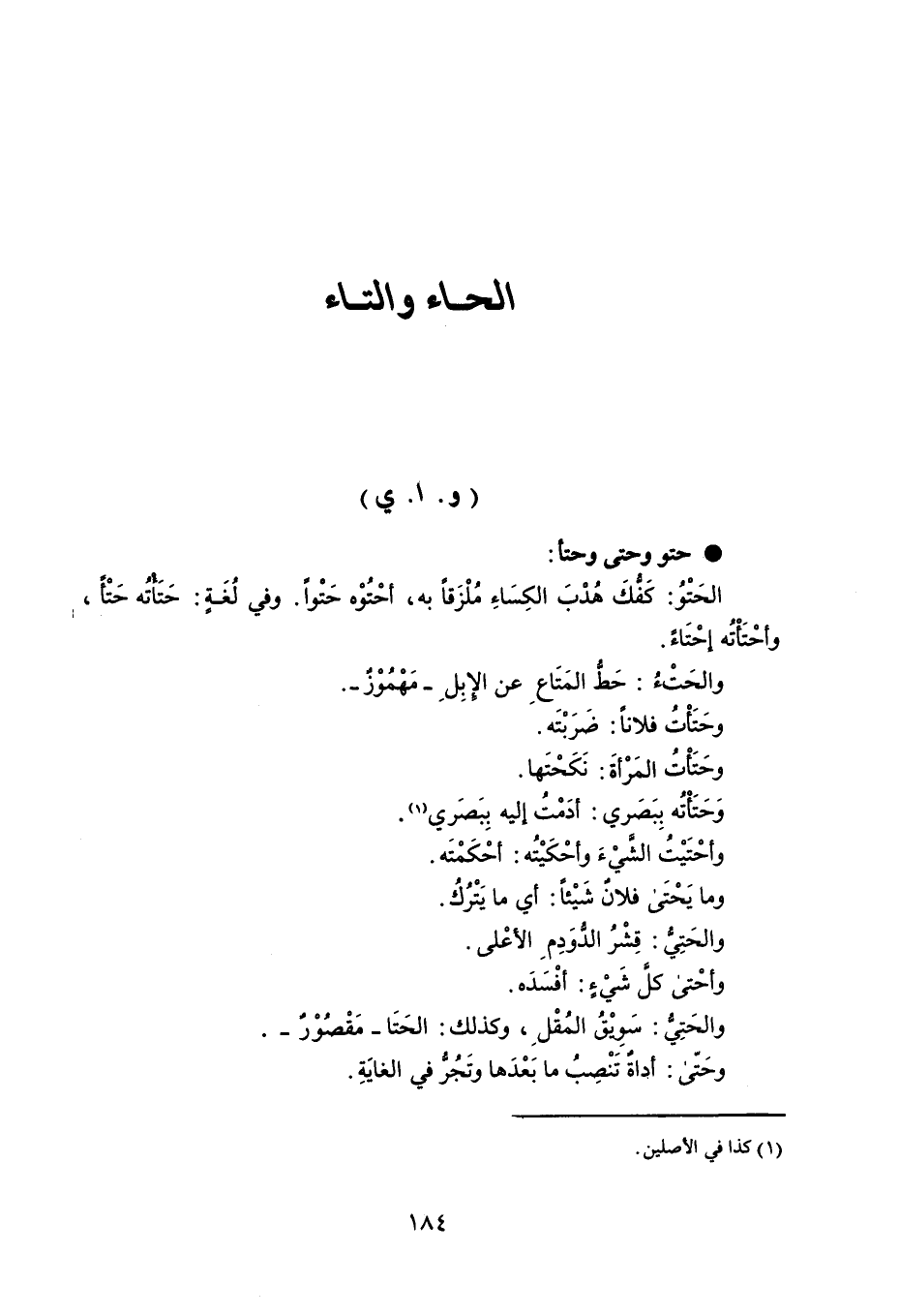 حتو وحتى وحتأ الحَتْوُ : كَفُّكَ هُدْبَ الكِسَاءِ مُلْزَقاً به ، أحْتُوْه حَتْواً ، وفي لُغَةٍ : حَتَأْتُه حَتْأً ، وأحْتَأْتُه إحْتَاءً . والحَتْءُ : حَطُّ المَتَاعِ عن الإبِلِ - مَهْمُوْزٌ - . وحَتَأْتُ فلاناً : ضَرَبْتَه . وحَتَأْتُ المَرْأَةَ : نَكَحْتَها . وَحَتَأْتُه بِبَصَري : أدَمْتُ إليه بِبَصَري . وأحْتَيْتُ الشَّيْءَ وأْحَكْيُته : أحْكَمْتَه . وما يَحْتَى فلانٌ شَيْئاً : أي ما يَتْرُكُ . والحَتِيُّ : قِشْرُ الدُّوَدِمِ الأعْلى . وأحْتى كلَّ شَيْءٍ : أفْسَدَه . والحَتِيُّ : سَوْيْقُ المُقْلِ ، وكذلك : الحَتَا - مَقْصُوْرٌ - . وحَتّى : أداةٌ تَنْصِبُ ما بَعْدَها وتَجُرُّ في الغايَةِ .