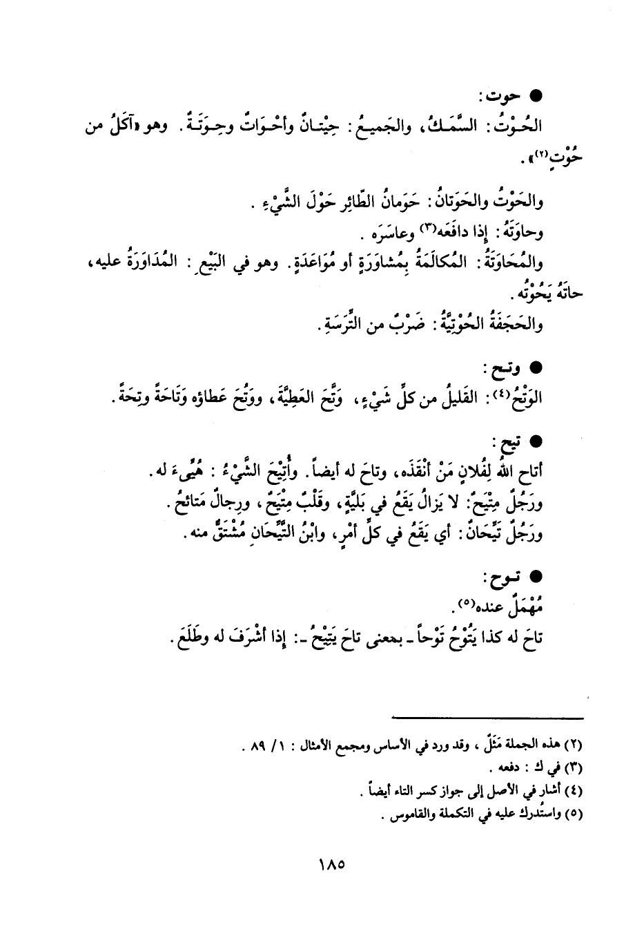 حوت الحُوْتُ : السَّمَكُ ، والجَميعُ : حِيْتانٌ وأحْوَاتٌ وحِوَتَةٌ . وهو : ' آكَلُ من حُوْتٍ ' . والحَوْتُ والحَوَتانُ : حَوَمانُ الطّائِر حَوْلَ الشَّيْءِ . وحاوَتَهُ : إذا دافَعَه وعاسَرَه . والمُحَاوَتَةُ : المُكالَمَةُ بِمُشاوَرَةٍ أو مُوَاعَدَةٍ . وهو في البَيْعِ : المُدَاوَرَةُ عليه ، حاتَهُ يَحُوْتُه . والحَجَفَةُ الحُوْتِيَّةُ : ضَرْبٌ من التِّرَسَةِ . وتح الوَتْحُ : القَليلُ من كلِّ شَيْءٍ ، وَّتَح العَطِيَّةَ ، ووَتُحَ عَطاؤه وَتَاحَةً وتِحَةً . تيح أتاح اللهُ لِفُلان مَنْ أنْقَذَه ، وتاحَ له أيضاً . وأُتِيْحَ الشَّيْءُ : هُيِّءَ له . ورَجُلٌ مِتْيَحٌ : لا يَزالُ يَقَعُ في بَليَّةٍ ، وقَلْبٌ مِتْيَحٌ ، ورِجالٌ مَتائحُ . ورَجُلٌ تَيِّحَانٌ : أي يَقَعُ في كلِّ أمْرٍ ، وابْنُ التَّيِّحَانِ مُشْتَقٌّ منه . توح مُهْمَلٌ عنده . تاحَ له كذا يَتُوْحُ تَوْحاً - بمعنى تاحَ يَتِيْحُ - : إذا أشْرَفَ له وطَلَعَ .