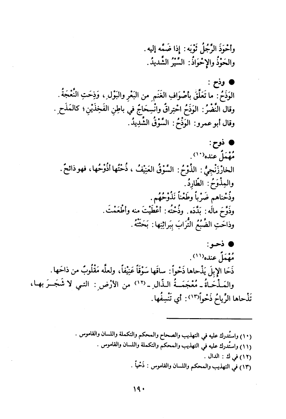 وأحْوَذَ الرَّجُلُ ثَوْبَه : إذا ضَمَّه إليه . والحَوْذُ والإحْوَاذُ : السَّيْرُ الشَّديدُ . وذح الوَذَحُ : ما تَعَلَّقَ بأصْوَافِ الغَنَمِ من البَعْرِ والبَوْلِ ، وَذِحَتِ النَّعْجَةُ . وقال النَّضْرُ : الوَذَحُ احْتِراقٌ وانْسِحَاجٌ في باطِنِ الفَخِذْينِ ؛ كالمَذَحِ . وقال أبو عمرو : الوَذْحُ : السَّوْقُ الشَّدِيدُ . ذوح مُهْمَلٌ عنده . الخارزنجي : الذَّوْحُ : السَّوْقُ العَنِيْفُ : ذُحْتُها أذُوْحُها ، فهو ذائحٌ . والمِذْوَحُ : الطّارِدُ . وذُحْناهم ضَرْباً وطَعْناً نَذُوْحُهُم . وذَوَّحَ مالَه : بَدَّدَه ، وذُحْتُه : أعْطَيْتَ منه وأطْعَمْتَ . وذاحَتِ الضَّبُعُ التُّرَابَ بِبَراثِنِها : بَحَثَتْهُ . ذحو مُهْمَلٌ عنده . ذَحَا الإبِلَ يَذْحاها ذَحْواً : ساقَها سَوْقَاً عَنِيْفاً ، ولعلَّه مَقْلُوبٌ من ذاحَها . والمَذْحَاةُ - مُعْجَمَةُ الذّالِ - من الأرْضِ : التي لا شَجَرَ بها ، تَذْحاها الرِّياحُ ذَحْواً : أي تَنْسِفُها .