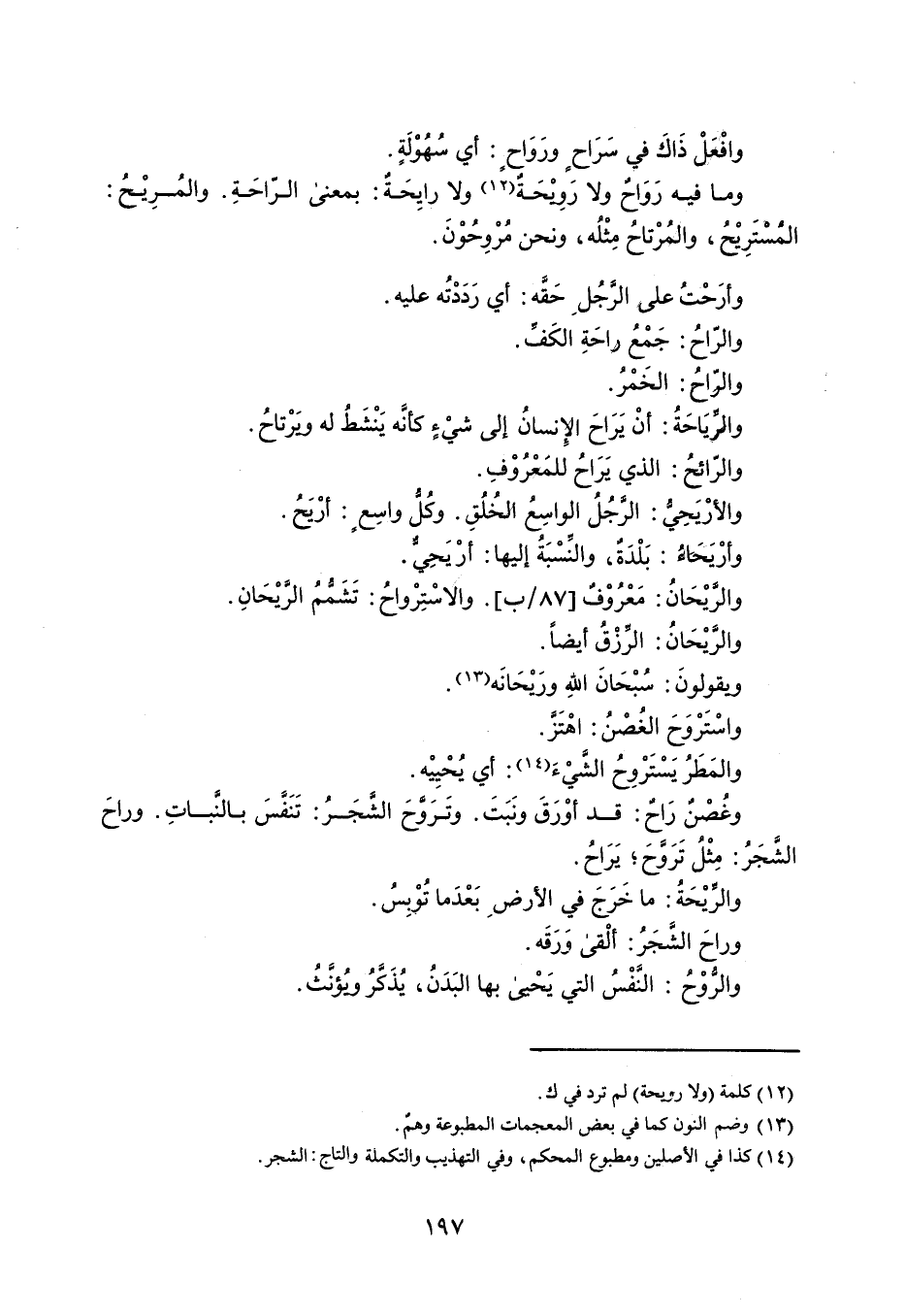 وافْعَلْ ذَاكَ في سَرَاحٍ ورَوَاحٍ : أي سُهُوْلَةٍ . وما فيه رَوَاحٌ ولا رَوِيْحَةٌ ولا رايِحَةٌ : بمعنى الرّاحَةِ . والمُرِيْحُ : المُسْتَرِيْحُ ، والمُرْتاحُ مِثْلُه ، ونحن مُرْوِحُوْنَ . وأرَحْتُ على الرَّجُلِ حَقَّه : أي رَدَدْتُه عليه . والرّاحُ : جَمْعُ راحَةِ الكَفِّ . والرَاحُ : الخَمْرُ . والرِّيَاحَةُ : أنْ يَرَاحَ الإنسان إلى شيْءٍ كأنَّه يَنْشَطُ له ويَرْتاحُ . والرّائحُ : الذي يَرَاحُ للمَعْرُوْفِ . والأرْيَحِيُّ : الرَّجُلُ الواسِعُ الخُلُقِ . وكُلُّ واسِعٍ : أرْيَحُ . وأرْيَحَاءُ : بَلْدَةٌ ، والنِّسْبَةُ إليها : أرْيَحِيٌّ . والرَّيْحَانُ : مَعْرْوفٌ . والاسْتِرْواحُ : تَشَمُّمُ الرَّيْحَانِ . والرَّيْحَانُ : الرِّزْقُ أيضاً . ويقولونَ : سُبْحَانَ اللهِ ورَيْحَانَه . واسْتَرْوَحَ الغُصْنُ : اهْتَزَّ . والمَطَرُ يَسْتَرْوِحُ الشَّيْءَ : أي يُحْيِيْه . وغُصْنٌ رَاحٌ : قد أوْرَقَ ونَبَتَ : وتَرَوَّحَ الشَّجَرُ : تَنَفَّسَ بالنَّباتِ . وراحَ الشَّجَرُ : مِثْلُ تَرَوَّحَ ، يَرَاحُ . والرِّيْحَةُ : ما خَرَجَ في الأرضِ بَعْدَما تُوْبِسُ . وراحَ الشَّجَرُ : ألْقى وَرَقَه . والرُّوْحُ : النَّفْسُ التي يَحْيى بها البَدَنُ ، يُذَكَّرُ ويُؤَّنُث .