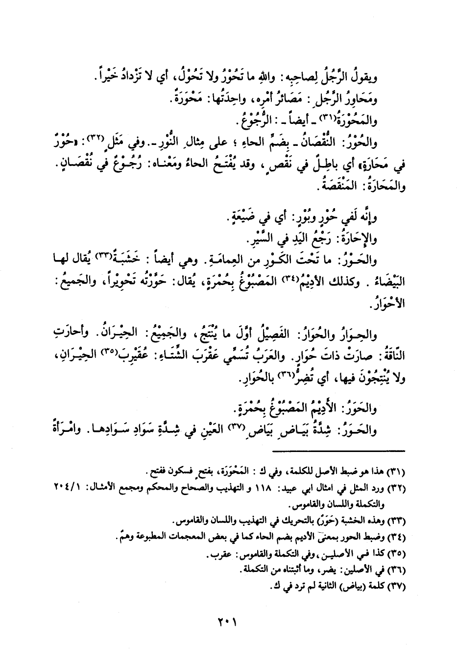 ويقولُ الرَّجُلُ لِصاحِبِه : واللِه ما تَحُوْرُ ولا تَحُوْلُ ، أي لا تَزْدادُ خَيْراً . ومَحَاوِرُ الرَّجُلِ : مَصَائرُ أمْرِه ، واحِدَتُها : مَحْوَرَةٌ . والمَحُوْرَةٌ - أيضاً - الرُّجُوْعُ . والحُوْرُ : النُّقْصَانُ - بِضَمِّ الحاءِ ؛ على مِثالِ النُّوْرِ - . وفي مَثَلٍ : ' حُوْرٌ في مَحَارَةٍ ' أي باطِلٌ في نَقْصٍ ، وقد يُفْتَحُ الحاءُ ومَعْناه : رُجُوْعٌ في نُقْصَانٍ . والمَحَارَةُ : المَنْقَصَةُ . وإنَّه لَفي حُوْرٍ وبُوْرٍ : أي في ضَيْعَةٍ . والإحَارَةُ : رَجْعُ اليَدِ في السَّيْرِ . والحَوْرُ : ما تَحْتَ الكَوْرِ من العِمامَةِ . وهي أيضاً : خَشَبَةٌ يُقال لها البَيْضَاءُ . وكذلك الأدِيْمُ المَصْبُوْغُ بِحُمْرَةٍ ، يُقال : حَوَّرْتُه تَحْوِيْراً ، والجَميعُ : الأحْوَارُ . والحِوَارُ والحُوَارُ : الفَصِيْلُ أوَّلَ ما يُنْتَجُ ، والجَمِيعُ : الحِيْرَانُ . وأحارَتِ النّاقَةُ : صارَتْ ذاتَ حُوَارٍ ، والعَرَبُ تُسَمِّي عَقْرَبَ الشِّتَاءِ : عُقَيْرِبَ الحِيْرَانِ ، ولا يُنْتِجُوْنَ فيها ، أي تُضِرُّ بالحُوَارِ . والحَوَرُ : الأَدْيْمُ المَصْبُوْغُ بِحُمْرَةٍ . والحَوَرُ : شِدَّةُ بَيَاضِ بَيَاضِ العَيْنِ في شِدَّةِ سَوَادِ سَوَادِها ، وامْرَأةٌ