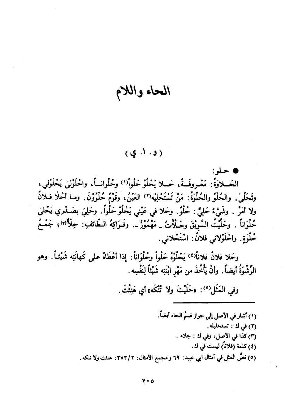 حلو الحَلاوَةُ : مَعْروفَةٌ ، حَلا يَحْلُوْ حَلْواً وحُلْواناً ، واحْلَوْلى يَحْلَوْلي ، وتَحَلَّى . والحُلْوُ والحُلْوَةُ : مَنْ تَسْتَحْلِيْه العَيْنُ وقَوْمٌ حُلْوُوْنَ . ومن أحْلا فلانٌ ولا أمَرَّ . وشَيْءٌ حَلِيٌ : حُلْو . وحَلا في عَيْني يَحْلُوْ حَلْواً . وحَلِيَ بصَدْري يَحْلى حُلْوَاناً . وحَلَّيْتُ السَّوِيْقَ وحَلَّأتُ - مَهْمُوْزٌ - وفَوَاكِهُ الطّائفِ : حِلْأ ؛ جَمْعُ حُلْوَةٍ . واحْلَوْلاني فلانٌ : اسْتَحْلاني . وحَلا فلانٌ فلاناً يَحْلُوْهُ حَلْواً وحُلْوَاناً : إذا أعْطَاهُ على كَهانَتِه شَيْئاً . وهو الرِّشْوَةُ أيضاً . وأنْ يَأْخُ َمن مَهْرِ ابْنَتِه شَيْئاً لِنَفْسِه . وفي المثل : ' حَلَيْتَ ولا تُنْكَه ' أي هَنِئْتَ .