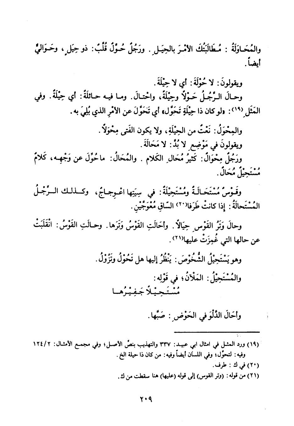 والمُحَاوَلَةُ : مُطَالَبَتُكَ الأمْرَ بالحِيَلِ . ور ؟ َجُلٌ حُوَّل قُلَّبٌ : ذو حِيَلٍ ، وحَوَاليٌّ أيضاً . ويقولونَ : لا حُوْلَةَ : أي لا حِيْلَةَ . وحالَ الرَّجُلُ حَوْلاً وحِيْلَةً ، واحْتَالَ ، وما فيه حائلَةٌ : أي حِيْلَةٌ . وفي المَثَلِ : ' لو كان ذا حِيْلَةٍ تَحَوَّل ' أي تَحَوَّلَ عن الأمْرِ الذي بُلِيَ به . والمِحْوَلُ : نَعْتٌ من الحِيْلَةِ . ولا يكون الفَتى مِحْوَلاً . ويقولونَ في مَوْضِعِ لا بُدَّ : لا مَحَالَةَ . ورَجُلٌ مِحْوَالٌ : كَثيرُ مُحَالِ الكَلام . والمُحَالُ : ما حُوِّلَ عن وَجْهِه ، كَلامٌ مُسْتَحِيْلٌ مُحَالٌ . وقَوْسٌ مُسْتَحَالَةٌ ومُسْتَحِيْلَةٌ : في سِيَتِها اعْوِجاجٌ ، وكذلك الرِّجْلُ المُسْتَحالَةٌ : إذا كانتْ طَرَفا السّاقِ مُعْوَجَّيْنِ . وحالَ وَتَرُ القَوْسِ حِيَالاً . وأحَالَتِ القَوْسُ وَتَرَها ، وحالَتِ القَوْسُ : انْقَلَبَتْ عن حالها التي غُمِزَتْ عليها . وهو يَسْتَحِيْلُ الشُّخُوْصَ : يَنْظُرُ إليها هل تَحُوْلُ وتَزُوْلُ . والمُسْتَحِيْلُ : المَلْآنُ ، في قوله : مُسْتَحِيْلاً جَفِيْرُها وأحَالَ الدَّلْوَ في الحَوْضِ : صَبَّها .