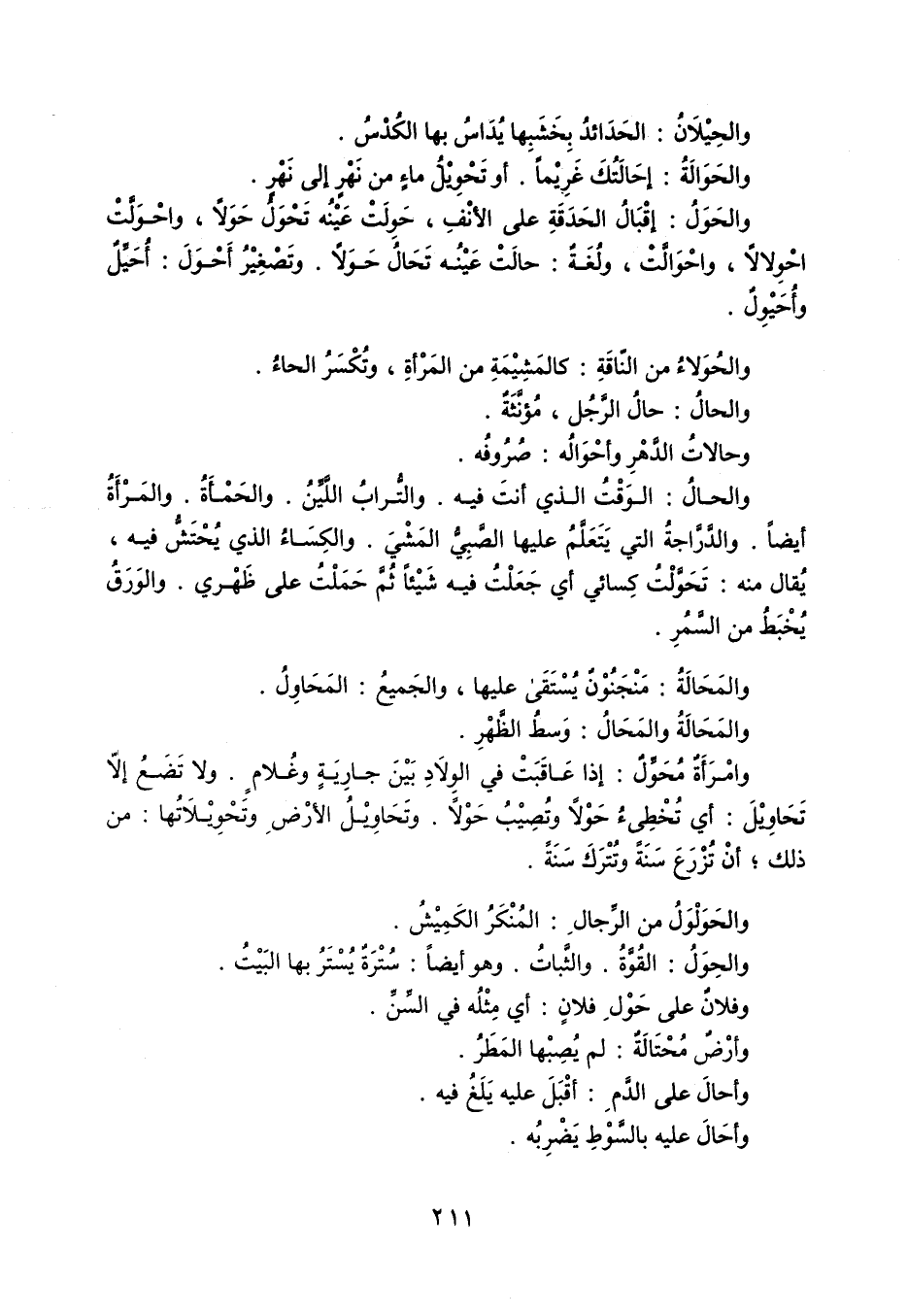 والحِيْلَانُ : الحَدَائدُ بِخَشَبِها يُدَاسُ بها الكُدْسُ . والحَوَالَةُ : إحَالَتُكَ غَرِيْماً . أو تَحْوِيْلُ ماءٍ من نَهْرٍ إلى نَهْرٍ . والحَوَلُ : إقْبَالُ الحَدَقَةِ على الأنْفِ ، حَوِلَتْ عَيْنُه تَحْوَلُ حَوَلاً ، واحْوَلَّتْ احْوِلالاً ، واحْوَالَّتْ ، ولُغَةٌ : حالَتْ عَيْنُه تَحَالُ حَوَلاً ، وتَصْغِيْرُ أَحْوَلَ : أُحَيِّلٌ وأُحَيْوِلٌ . والحُوَلاءُ من النّاقَةِ : كالمَشِيْمَةِ من المَرْأةِ ، وتُكْسَرُ الحاءُ . والحالُ : حالُ الرَّجُل ، مُؤنَّثَةٌ . وحالاتُ الدَّهْرِ وأحْوَالُه : صُرُوفُه . والحالُ : الوَقْتُ الذي أنتَ فيه ، والتُّرابُ اللَّيِّنُ . والحَمْأَةُ . والمَرْأَةُ أيضاً . والدَّرَّاجةُ التي يَتَعَلَّمُ عليها الصَّبِيُّ المَشْيَ . والكِسَاءُ الذي يُحْتَشُّ فيه ، يُقال منه : تَحَوَّلْتُ كِسائي أي جَعَلْتُ فيه شَيْئاً ثُمَّ حَمَلْتُ على ظَهْري . والوَرَقُ يُخْبَطُ من السَّمُرِ . والَمَحالَةُ : مَنْجَنُوْنٌ يُسْتَقَي عليها ، والجَميعُ : المَحَاوِلُ . والمَحَالَةُ والمَحَالُ : وَسطُ الظَّهْرِ . وامْرَأَةٌ مُحَوِّلٌ : إذا عَاقَبَتْ في الوِلَادِ بَيْنَ جارِيَةٍ وغُلامٍ . ولا تَضَعُ إلاّ تَحَاوِيْلَ : أي تُخْطِئُ حَوْلاً وتُصِيْبُ حَوْلاً ، وتَحَاوِيْلُ الأرْضِ وتَحْوِيْلَاتُها : من ذلك ، أنْ تُزْرَعَ سَنَةً وتُتْرَكَ سَنَةً . والحَوَلْوَلُ من الرِّجالِ : المُنْكَرُ الكَمِيْشُ . والحِوَلُ : القُوَّةُ . والثَّباتُ . وهو أيضاً : سُتْرَةٌ يُسْتَرُ بها البَيْتُ . وفلانٌ على حَوْلِ فلانٍ : أي مِثْلُه في السِّنِّ . وأرْضٌ مُحْتَالَةٌ : لم يُصِبْها المَطَرُ . وأحالَ على الدَّمِ : أقْبَلَ عليه يَلَغُ فيه . وأحَالَ عليه بالسَّوْطِ يَضْرِبُه .