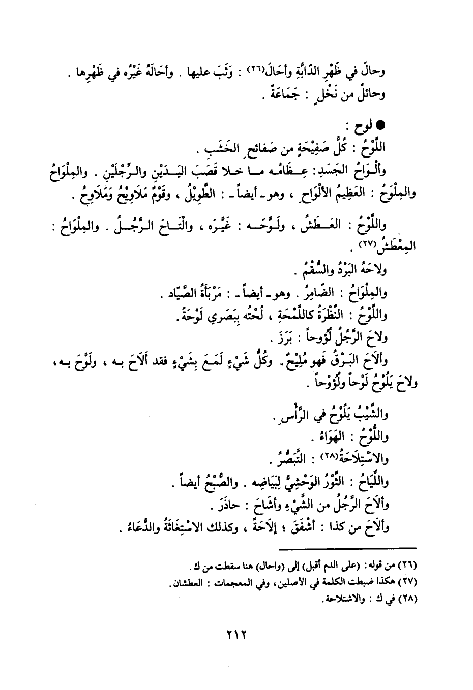وحالَ في ظَهْرِ الدّابَّةِ وأحَالَ : وَثَبَ عليها ، وأحَالَهُ غَيْرُه في ظَهْرِها . وحائلٌ من نَخْلٍ : جَمَاعَةٌ . لوح اللَّوْحُ : كُلُّ صَفِيْحَةٍ من صَفائحِ الخَشَبِ . وألْوَاحُ الجَسَدِ : عِظَامُه ما خلا قَصَبَ اليَدَيْنِ والرِّجْلَيْنِ . والمِلْوَاحُ والمِلْوَحُ : العَظْيمُ الألْوَاحِ ، وهو - أيضاً - : الطَّوِيْلُ ، وقَوْمٌ مَلاَوِيْحُ وَمَلاَوِحُ . واللَّوْحُ : العَطَشُ ، ولَوَّحَه : غَيَّرَه ، والْتَاحَ الرَّجُلُ . والمِلْوَاحُ : المِعْطَشُ . ولاحَهُ البَرْدُ والسُّقْمُ . والمِلْوَاحُ : الضّامِرُ . وهو - أيضاً - : مَرْبَأَةُ الصَّيّاد . واللَّوْحُ : النَّظْرَةُ كاللَّمْحَةِ ، لُحْتُه بِبَصَري لَوْحَةٌ . ولاحَ الرَّجُلُ لُؤُوحاً : بَرَزَ . وألاَحَ البَرْقُ فَهو مُلِيْحٌ . وكُلُّ شَيْءٍ لَمَعَ بِشَيْءٍ فقد أَلَاحَ به ، ولَوَّحَ به ولاحَ يَلُوْحُ لَوْحاً ولُؤُوْحاً . والشَّيْبُ يَلُوْحُ في الرَّأْسِ . واللُّوْحُ : الهَوَاءُ . والاسْتِلاَحَةُ : التَّبَصُّرُ . واللِّيَاحُ : الثَّوْرُ الوَحْشِيُّ لِبَيَاضِه . والصُّبْحُ أيضاً . وألَاحَ الرَّجُلُ من الشَّيْءِ وأشَاحَ : حاذَرَ . وألاَحَ من كذا : أشْفَقَ ؛ إلَاَحةً ، وكذلك الاسْتِغَاثَةُ والدُّعَاءُ .