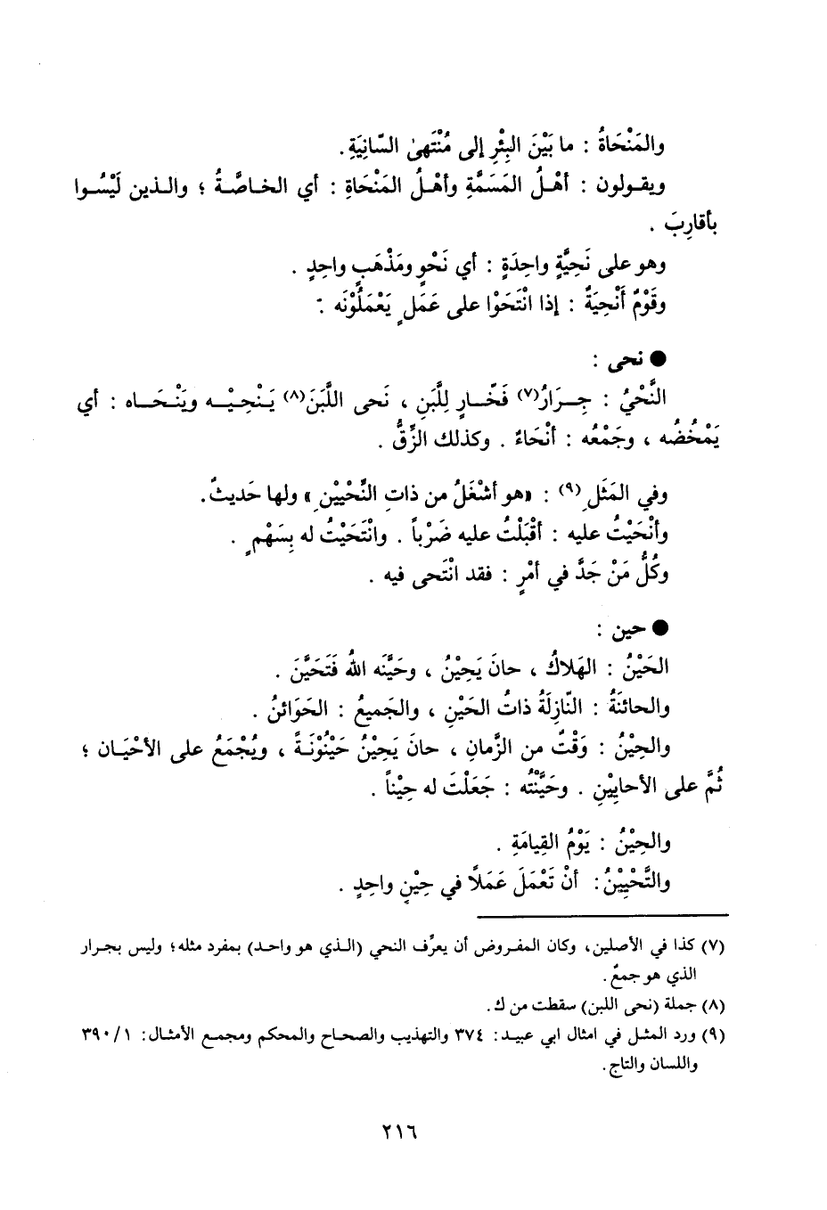 والمَنْحَاةُ : ما بَيْنَ البِئْرِ إلى مُنْتَهى السّانِيَةِ . ويقولون : أهْلُ المَسَمَّةِ وأهْلُ المَنْحَاةِ : أي الخاصَّةُ ، والذين لَيْسُوا بأقارِبَ . وهو على نَحِيَّةٍ واحِدَةٍ : أي نَحْوٍ ومَذْهَبٍ واحِدٍ . وقَوْمٌ أَنْحِيَةٌ : إذا انْتَحَوْا على عَمَلٍ يَعْمَلُوَنه . نحى النَّحْىُ : جِرَارُ فَخّارٍ لِلَّبَنِ ، نَحى اللَّبَنَ يَنْحِيْه ويَنْحَاه : أي يَمْخُضُه ، وجَمْعُه : أنْحَاءٌ . وكذلك الزِّقُّ . وفي المَثَلِ : ' هو أشْغَلُ من ذاتِ النِّحْييْنِ ' ولها حَديثٌ . وأنْحَيْتُ عليه : أقْبَلْتُ عليه ضَرْباً ، وانْتَحَيْتُ له بِسَهْمٍ . وكُلُّ مَنْ جَدَّ في أمْرٍ : فقد انْتَحى فيه . حين الحَيْنُ : الهَلاكُ ، حانَ يَحِيْنُ ، وحَيَّنَه اللهُ فَتَحَيَّنَ . والحائنَةُ : النّازِلَةُ ذاتُ الحَيْنِ ، والجَميعُ : الحَوَائنُ . والحِيْنُ : وَقْتٌ من الزَّمانِ ، حانَ يَحِيْنُ حَيْنُوْنَةً ، ويُجْمَعُ على الأحْيَان ؛ ثُمَّ على الأحايِيْنِ ، وحَيَّنْتُه : جَعَلْتَ له حِيْناً . والحِيْنُ : يَوْمُ القِيامَةِ . والتَّحْيِيْنُ : أنْ تَعْمَلَ عَمَلاً في حِيْنٍ واحِدٍ .