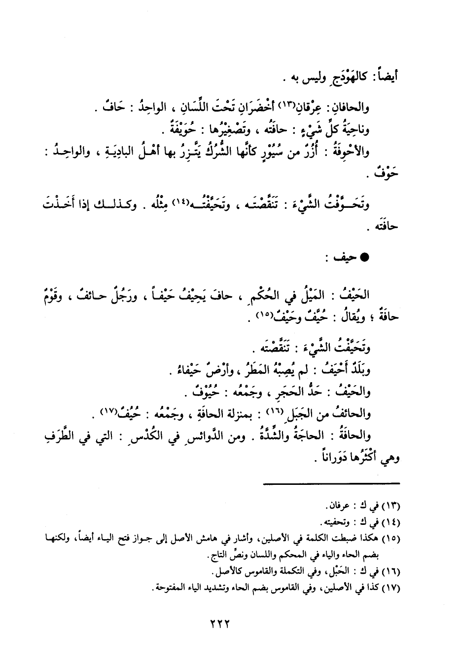 أيضاً : كالهَوْدَجِ وليس به . والحافانِ : عِرْقانِ أخْضَرَانِ تَحْتَ اللِّسَانِ ، الواحِدُ : حَافٌ . وناحِيَةُ كلِّ شَيْءٍ : حافَتُه ، وتَصْغِيْرُها : حُوَيْفَةٌ . والأحْوِفَةُ : أُزُرٌ من سُيُوْرٍ كأنَّها الشُّرُكُ يَتَّزِرُ بها أهْلُ البادِيَةِ ، والواحِدُ : حَوْفٌ . وتَحَوَّفْت الشَّيْءَ : تَنَقَّصْتَه ، وتَحَيَّفْتُه مِثْلُه . وكذلك إذا أَخَذْتَ حافَتَه . حيف الحَيْفُ : المَيْلُ في الحُكْمِ ، حافَ يَحِيْفُ حَيْفاً ، ورَجُلٌ حائفٌ ، وقَوْمٌ حافَةٌ ، ويُقالُ : حُيَّفٌ وحَيْفٌ . وتَحَيَّفْتُ الشَّيْءَ : تَنَقَّصْتَه . وبَلَدٌ أَحْيَفُ : لم يُصِبْهُ المَطَرُ ، وأرْضٌ حَيْفاءُ . والحَيْفُ : حَدُّ الحَجَرِ ، وجَمْعُه : حُيُوْفٌ . والحائفُ من الجَبَلِ : بمنزلة الحافَةِ ، وجَمْعهُ : حُيُفٌ . والحافَةُ : الحاجَةُ والشِّدَّةُ . ومن الدَّوائسِ في الكُدْسِ : التي في الطَّرَفِ وهي أكْثَرُها دَوَراناً .
