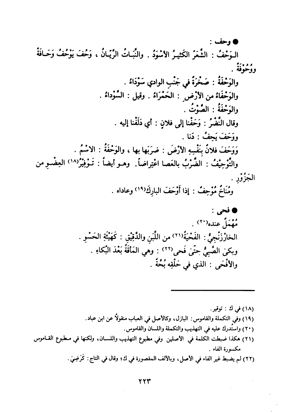 وحف الوَحْفُ : الشَّعَرُ الكَثيرُ الأسْوَدُ . والنَّبَاتُ الرَّيّانُ ، وَحُفَ يَوْحُفُ وَحَافَةً ووُحُوْفَةً . والوَحْفَةُ : صَخْرَةٌ في جَنْبِ الوادي سَوْدَاءُ . والوَحْفَاءُ من الأرْضِ : الحَمْرَاءُ . وقيل : السَّوْداءُ . والوَحْفَةُ : الصَّوْتُ . وقال النَّضْرُ : وَحَفْنا إلى فلانٍ : أي دَلَفْنا إليه . ووَحَفَ يَحِفُ : دَنا . وَوَحَفَ فلانٌ بِنَفْسِهِ الأرْضَ : ضرَبَها بها ، والوَحْفَةُ : الاسْمُ . والتَّوْحِيْفُ : الضَّرْبُ بالعَصا اعْتِراضاً ، وهو أيضاً : تَوْفِيْرُ العِضْوِ من الجَزُوْرِ . ومُنَاخٌ مُوْحِفٌ : إذا أَوْحَفَ البارِكَ وعاداه . فحى مُهْمَلٌ عنده . الخارزنجي : الفَحْيَةُ من اللَّبَنِ والدَّقِيْقِ : كَهَيْئَةِ الحَسْوِ . وبكى الصَّبِيُّ حتّى فَحى : وهي المَأقَةُ بَعْدَ البُكاءِ . والأفْحَى : الذي في حَلْقِه بُحَّةٌ .