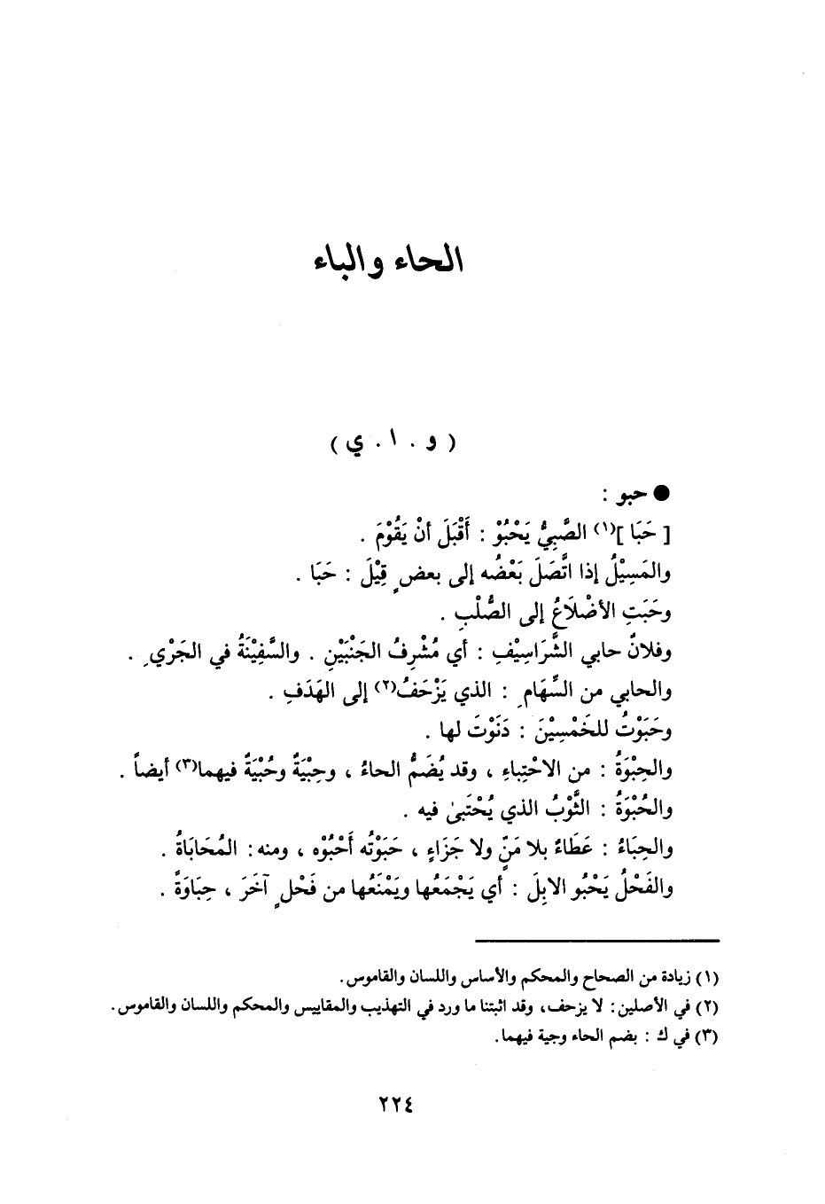 حبو حَبَا الصَّبِيُّ يَحْبُوْ : أَقْبَلَ أنْ يَقُوْمَ . والمَسِيْلُ إذا اتَّصَلَ بَعْضُه إلى بعضٍ قِيْلَ : حَبَا . وحَبَتِ الأضْلاَعُ إلى الصُّلْبِ . وفلانٌ حابي الشَّرَاسِيْفِ : أي مُشْرِفُ الجَنْبَيْنِ ، والسَّفِيْنَةُ في الجَرْيِ . والحابي من السِّهَامِ : الذي يَزْحَفُ إلى الهَدَفِ . وحَبَوْتُ للخَمْسِيْنَ : دَنَوْتَ لها . والحِبْوَةُ من الاحْتِباءِ ، وقد يُضَمُّ الحاءُ ، وحِبْيَةٌ وحُبْيَةٌ فيهما أيضاً . والحُبْوَةُ : الثَّوْبُ الذي يُحْتَبى فيه . والحِبَاءُ : عَطَاءٌ بلا مَنٍّ ولا جَزَاءٍ ، حَبَوْتُه أَحْبُوْه ، ومنه : المُحَابَاةُ . والفَحْلُ يَحْبُو الإبِلَ : أي يَجْمَعُها ويَمْنَعُها من فَحْلٍ آخَرَ ، حِبَاوَةً .