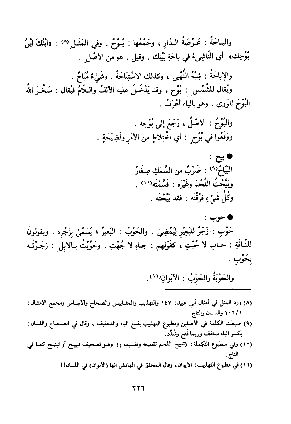 والباحَةُ : عَرْصَةُ الدّارِ ، وجَمْعُها : بُوْحٌ ، وفي المَثَلِ : ' ابْنُكَ ابْنُ بُوْحِكَ ' أي النّاشِيءُ في باحَةِ بَيْتِك ، وقيل : هو من الأصْلِ . والإباحَةُ : شِبْهُ النُّهْبي ، وكذلك الاسْتِبَاحَةُ ، وشَيْءٌ مُبَاحٌ . ويُقال للشَّمْسِ : بُوْح ، وقد يَدْخُلُ عليه الألفُ واللاّمُ فيُقال : سَخَّرَ اللهُ البُوْحَ للوَرى ، وهو بالياء أعْرَفُ . والبُوْحُ : الأصْلُ ، رَجَعَ إلى بُوْحِه . ووَقَعُوا في بُوْحٍ : أي اخْتِلاطٍ من الأمْرِ وفَضِيْحَةٍ . بيح البَيّاحُ : ضَرْبٌ من السَّمَكِ صِغَارٌ . وبَيَّحْتُ اللَّحْمَ وغَيْرَه : قَسَّمْتَه . وكُلُّ شَيْءٍ فَرَّقْتَه : فقد بَيَّحْتَه . حوب حَوْبِ : زَجْرٌ للبَعْيِر لِيَمْضِيَ . والحَوْبُ : البَعيرُ ، يُسَمّى بِزَجْرِه ، ويقولونَ للنّاقَةِ : حابِ لا حُبْتِ ، كقَوْلهم : جاهِ لا جُهْتِ . وحَوَّبْتُ بالإبِلِ : زَجَرْتَه بِحَوْبِ . والحَوْبَةُ والحَوْبُ : الأبَوانِ .