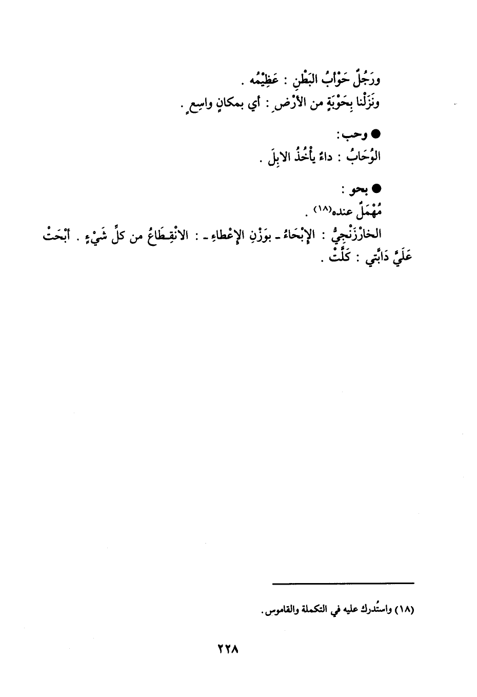ورَجُلٌ حَوْأبُ البَطْنِ : عَظِيْمُه . ونَزَلْنا بِحَوْبَةٍ من الأرْضِ : أي بمكانٍ واسِعٍ . وحب الوُحَابُ داءٌ يأْخُذُ الإبِلَ . بحو مُهْمَلٌ عنده . الخارزنجي : الإبْحَاءُ - بوَزْنِ الإعْطاءِ - : الانْقِطَاعُ من كلِّ شَيْءٍ . أبْحَتْ عَلَيَّ دَابَّتي : كَلَّتْ .