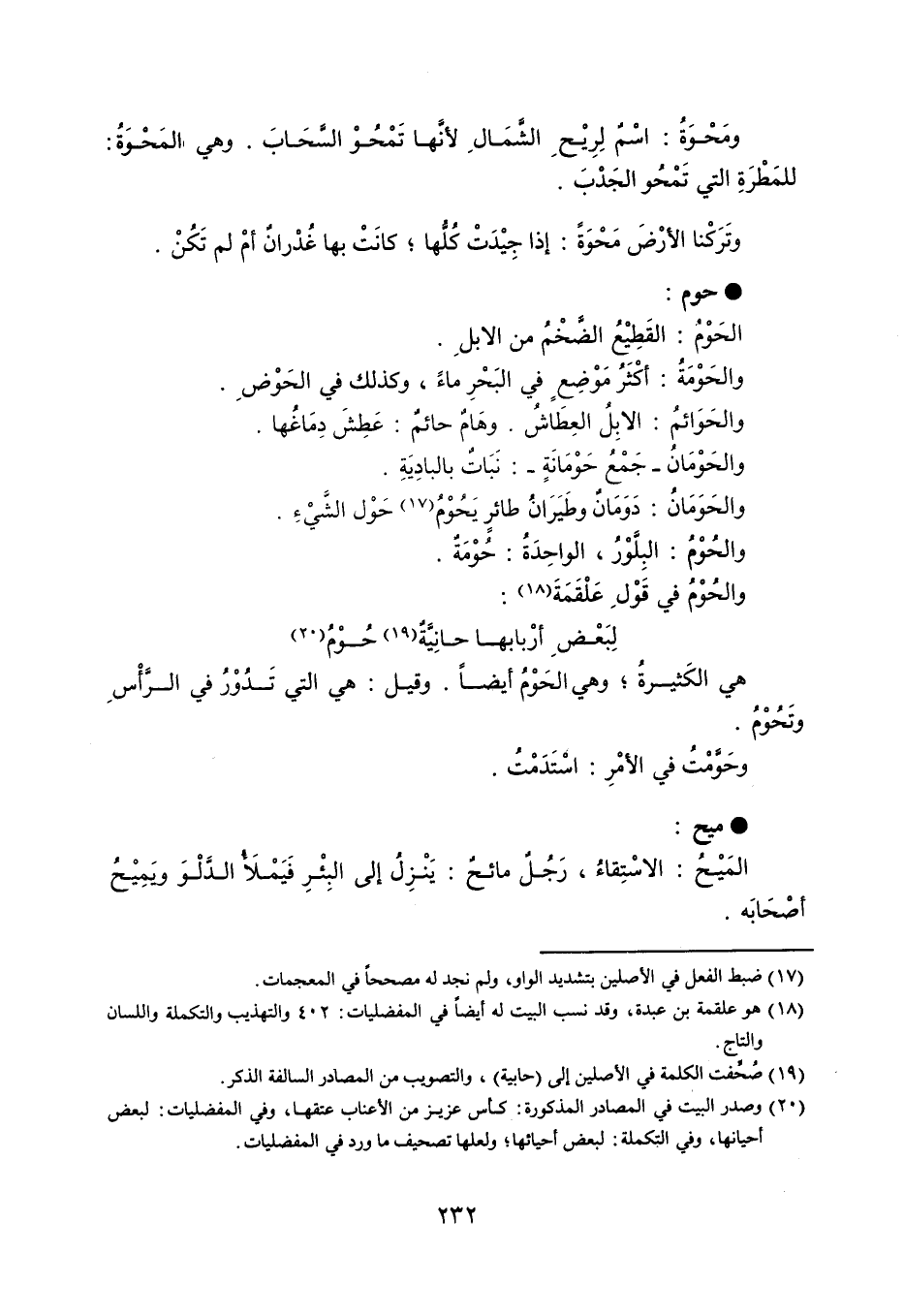 ومَحْوَةُ : اسْمٌ لِرْيْحِ الشَّمَالِ لأنَّها تَمْحُوْ السَّحَابَ . وهي المَحْوَةُ : للمَطْرَةِ التي تَمْحُو الجَدْبَ . وتَرَكْنا الأرْضَ مَحْوَةً : إذا جِيْدَتْ كُلُّها ، كانَتْ بها غُدْارنٌ أمْ لم تَكُنْ . حوم الحَوْمُ : القَطِيْعُ الضَّخْمُ من الإبلِ . والحَوْمَةُ : أكْثَرُ مَوْضِعٍ في البَحْرِ ماءً ، وكذلك في الحَوْضِ . والحَوَائمُ : الإبِلُ العِطَاشُ ، وهَامٌ حائمٌ : عَطِشَ دِمَاغُها . والحَوْمَانُ - جَمْعُ حَوْمَانَةٍ - : نَبَاتٌ بالبادِيَةِ . والحَوَمَانُ : دَوَمَانٌ وطَيَرَانُ طائرٍ يَحُوْمُ حَوْل الشَّيْءِ . والحُوْمُ : البِلَّوْرُ ، الواحِدَةُ : حُوْمَةٌ . والحُوْمُ في قول علقمة : لِبَعْضِ أرْبابها حانِيًّةٌ حُوْمُ هي الكَثيرةُ ، وهي الحَوْمُ أيضاً ، وقيل : هي التي تَدُوْرُ في الرَّأْسِ وتَحُوْمُ . وحَوَّمْتُ في الأمْرِ : اسْتَدَمْتُ . ميح المَيْحُ : الاسْتِقاءُ ، رَجُلٌ مائحٌ : يَنْزِلُ إلى البِئْرِ فَيَمْلَأ الدَّلْوَ ويَمِيْحُ أصْحَابَه .