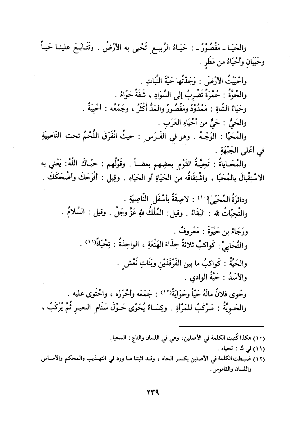 والحَيَا - مَقْصُوْرٌ - حَيَاءُ الرَّبيعِ تَحْيى به الأرْضُ ، وتَتَابَعَ علينا حَياً وحَيَيَانِ وأحْيَاءُ من مَطَرٍ . وأحْيَيْتُ الأرْضَ : وَجَدْتُها حَيَّةَ النَّبَاتِ . والحُوَّةُ : حُمْرَةٌ تَضْرِبُ إلى السَّوَادِ ، شَفَةٌ حَوّاءُ . وحَيَاءُ الشّاةِ : مَمْدُوْدٌ ومَقْصُورٌ والمَدُّ أَكْثَرُ ، وجَمْعُه أحْيِيَةٌ . والحَيُّ : حَيٌ من أحْيَاءِ العَرَبِ . والمُحَيّا : الوَجْهُ ، وهو في الفَرَسِ : حيثُ انْفَرَقَ اللَّحْمُ تحت النّاصِيَةِ فب أعْلى الجَبْهَةِ . والمُحَاياةُ : تَحِيَّةُ القَوْمِ بعضِهم بعضاً . وقَوْلُهم : حيّاكَ اللَّهُ : يَعْني به الاسْتِقْبالَ بالمُحَيّا ، واشْتِقَاقُه من الحَيَاةِ أو الحَيَاءِ . وقِيل : أفْرَحَكَ وأضْحَكَكَ . ودائرَةُ المُحَيّى : لاصِقَةٌ بأسْفَلِ النّاصِيَةِ . والتَّحِيّاتُ لله : البَقَاءُ ، وقيل المُلْكُ للِه عزَّ وجلَّ . وقيل : السَّلامُ . ورَجَاءُ بن حَيْوَةَ : مَعْروفٌ . والتَّحَايِيْ : كَواكبُ ثلاثةٌ حِذَاءَ الهَنْعَةِ ، الواحِدَةُ : تِحْيَاةٌ . والحَيَّةُ : كَواكبُ ما بين الفَرْقَدَيْنِ وبَنَاتِ نَعْشٍ . والأسَدُ : حَيَّةُ الوادي . وحَوي فلانٌ مالَهُ حَيّاً وحَوَايَةً : جَمَعَه وأحْرَزَه ، واحْتَوى عليه . والحَوِيَّةُ : مَرْكَبٌ للمَرْأةِ ، وكِسَاءٌ يُحَوّي حَوْلَ سَنَامِ البِعيرِ ثُمَّ يُرْكُبُ ،
