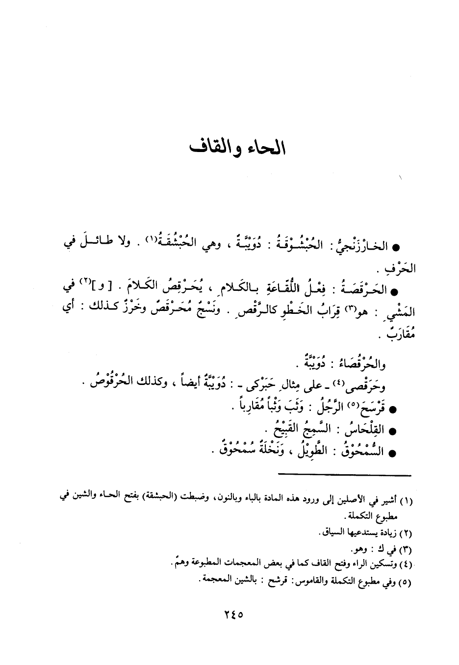 الخارزنجي : الحُبْشُوْقَةُ : دُوَيْبَّةٌ ، وهي الحُبْشُقَةُ . ولا طائلَ في الحَرْفِ . الحَرْقَصَةُ : فِعْلُ اللُّقّاعَةِ بالكَلامِ ، يُحَرْقِصُ الكَلاَمِ . و المَشْيِ : هو قِرَابُ الخَطْوِ كالرَّقْصِ . ونَسْجٌ مُحَرْقَصٌ وخَرْزٌ كذلك : أي مُقَارَبٌ . والحُرْقُصَاءُ : دُوَيْبَّةٌ . وحَرَقْصى - على مِثالِ حَبَرْكى - : دُوَيْبًّةٌ أيضاً . وكذلك الحُرْقُوْصُ . قَرْسَحَ الرَّجُلُ : وَثَبَ وَثْباًُ مُقَارِباً . القِلْحَاسُ : السَّمِجُ القَبِيْحُ . السُّمْحُوْقُ : الطَّوِيْلُ ، وَنَخْلَةٌ سُمْحُوْقٌ .
