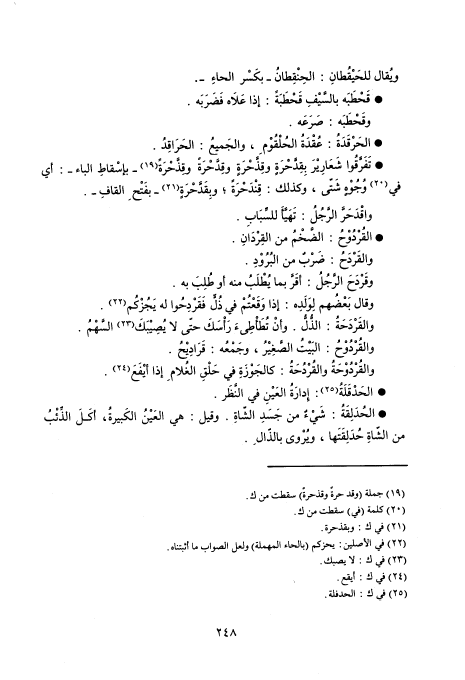 ويُقال للحَيْقُطانِ : الحِنْقِطانُ - بكَسْر الحاءِ - . قَحْطَبَه بالسَّيْفِ قَحْطَبَةً : إذا عَلاَه فَضَرَبَه . وقَحْطَبَه : صَرَعَه . الحَرْقَدَةُ : عُقْدَةُ الحُلْقُوْمِ ، والجَميعُ : الحَرَاقِدُ . تَفَرَّقُوا شَعَارِيْرَ بِقِدَّحْرَةٍ وقِذَّحْرَةٍ وقِدَّحْرَةً وقِذَّحْرَةً - بإسْقاطِ الباء - : أي في وُجُوْهٍ شَتّى وكذلك : قِنْدَحْرَةً ، وبِقَدَّحْرَةٍ - بفَتْحِ القافِ - . واقْدَحَرَّ الرَّجُلُ : تَهَيَّأَ للسِّبَابِ . القُرْدُوْحُ : الضَّخْمُ من القِرْدَانِ . والقَرْدَحُ : ضَرْبٌ من البُرُوْدِ . وقَرْدَحُ الرَّجُلُ : أقَرَّ بما يُطْلَبُ منه أو طُلِبَ به . وقال بَعْضُهم لِوَلَدِه : إذا وَقَعْتُمْ في ذُلٍّ فَقَرْدِحُوا له يَجُزْكمُ . والقَرْدَحَةُ : الذُّلُّ . وأنْ تُطَأْطِئَ رَأْسَكَ حتّى لا يُصِيْبَكَ السَّهْمُ . والقُرْدُوْحُ : البَيْتُ الصَّغِيْرُ ، وجَمْعُه : قَرَادِيْحُ . والقُرْدُوْحَةُ والقُرْدُحَةُ : كالجَوْزَةِ في حَلْقِ الغُلامِ إذا أيْفَعَ . الحَدْقَلَةُ : إدارَةُ العَيْنِ في النَّظَر . الحُدَلِقَةُ : شَيْءٌٍ من جَسَدِ الشّاةِ . وقيل : هي العَيْنُ الكَبيرةُ ، أكَلَ الذِّئْبُ من الشّاةِ حُدَلِقَتَها ، ويُرْوى بالذّالِ .
