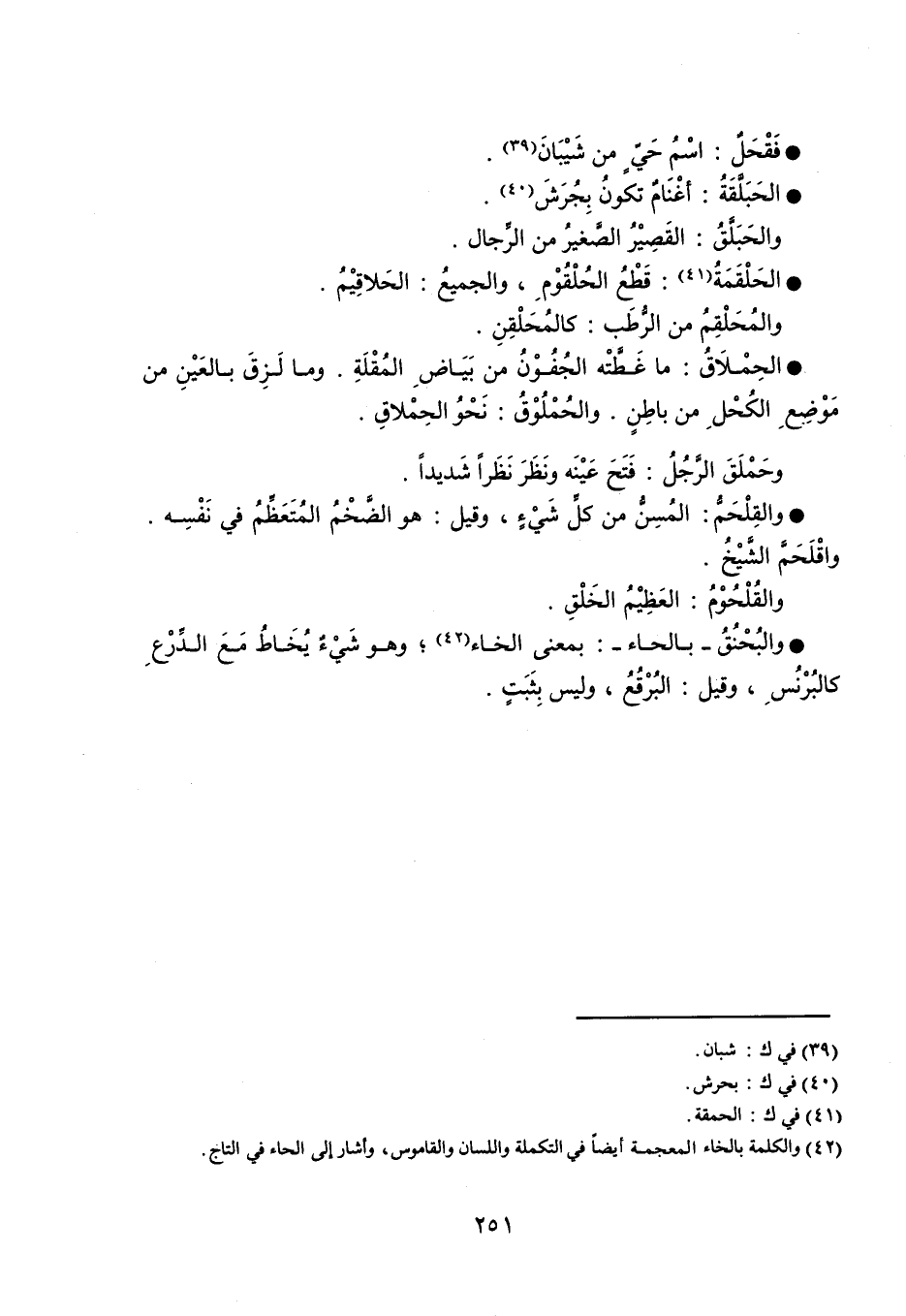فَقْحَلٌ : اسْمُ حَيٍّ من شَيْبَانَ . الحَبَلَّقَةُ : أغْنَامٌ تكونُ بِجُرَشَ . والحَبَلَّقُ : القَصِيْرُ الصَّغيرُ من الرِّجال . الحَلْقَمَةُ : قَطْعُ الحُلْقُوْم ، والجميعُ : الحَلاقِيْمُ . والمُحَلْقِمُ من الرُّطَب : كالمُحَلْقِنِ . الحِمْلاَقُ : ما غَطَّتْه الجُفُوْنُ من بَيَاضِ المُقْلَةِ . وما لَزِقَ بالعَيْنِ من مَوْضِعِ الكُحْلِ من باطِنٍ . والحُمْلُوْقُ : نَحْوُ الحِمْلاقِ . وحَمْلَقَ الرَّجُلُ : فَتَحَ عَيْنَه ونَظَرَ نَظَراً شَديداً . والقِلْحَمُّ : المُسِنُّ من كلِّ شَيْءٍ ، وقيل : هو الضَّخْمُ المُتَعَظِّمُ في نَفْسِه . واقْلَحَمَّ الشَّيْخُ . والقُلْحُوْمُ : العَظِيْمُ الخَلْقِ . والبُحْنُقُ - بالحاء - : بمعنى الخاء ؛ وهو شَيْءٌ يُخَاطُ مَعَ الدِّرْعِ كالبُرْنُسِ ، وقيل : البُرْقُعُ ، وليس بِثَبَتٍ .