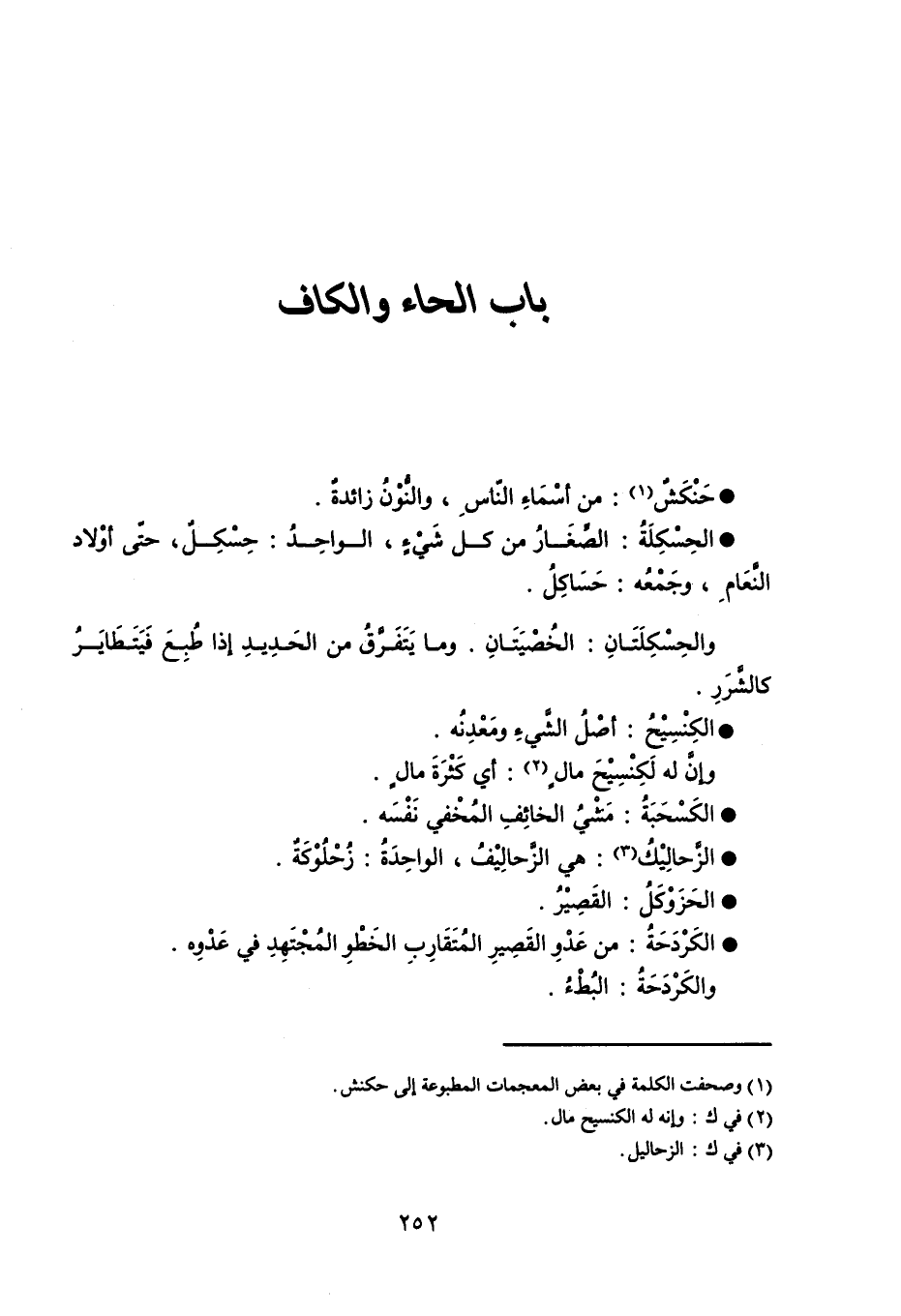 حَنْكَشٌ : من أسْمَاءِ النّاسِ ، والنُّوْنُ زائدةٌ . الحِسْكِلَةُ : الصِّغَارُ من كل شَيْءٍ ، الواحِدُ : حِسْكِلٌ ، حتّى أوْلاد النَّعَامِ ، وجَمْعُه : حَسَاكِلُ . والحِسْكِلَتَانِ : الخُصْيَتَانِ ، وما يَتَفَرَّقُ من الحَدِيدِ إذا طُبِعَ فَيَتَطَايَرُ كالشَّرَرِ . الكِنْسِيْحُ : أصْلُ الشَّيءِ ومَعْدِنُه . وإنَّ له لَكِنْسِيْحَ مالٍ : أي كَثْرَةَ مالٍ . الكَسْحَبَةُ : مَشْيُ الخائِفِ المُخْفي نَفْسَه . الزَّحالِيْكُ : هي الزَّحالِيْفُ ، الواحِدَةُ : زُحْلُوْكَةٌ . الحَزَوْكَلُ : القَصِيْرُ . الكَرْدَحَةُ : من عَدْوِ القَصِيرِ المُتَقَارِبِ الخَطْوِ المُجْتَهِدِ في عَدْوِه . والكَرْدَحَةُ . البُطْءُ .