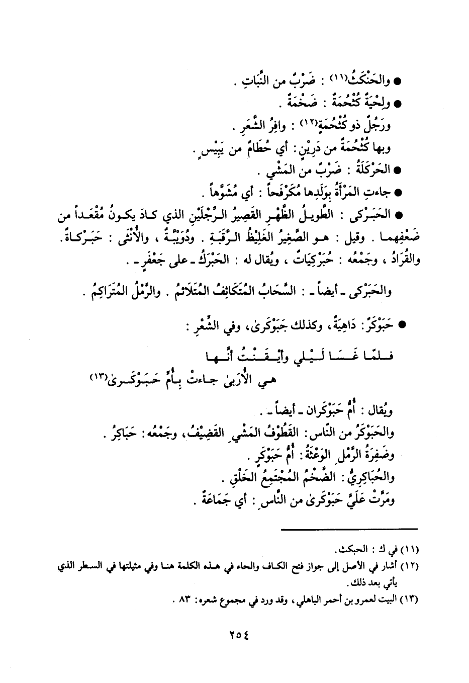 والحَنْكَثُ : ضَرْبٌ من النَّبَاتِ . ولِحْيَةٌ كُثْحُمَةٌ : ضَخْمَةٌ . ورُجُلٌ ذو كُثْحُمَةٍ : وافِرُ الشَّعَرِ . وبها كُثْحُمَةٌ من دَرِيْنٍ : أي حُطَامٌ من يَبِيْسٍ . الحَرْكَلَةُ : ضَرْبٌ من المَشْي . جاءتِ المَرْأَةُ بِوَلَدِها مُكَرْفَحاً : أي مُشَوَّهاً . الحَبَرْكى : الطَّويلُ الظَّهْرِ القَصِيرُ الرِّجْلَيْنِ الذي كادَ يكونُ مُقْعَداً من ضَعْفِهما . وقيل : هو الصَّغِيرُ الغَلِيْظُ الرَّقَبَةِ ، ودُوَيْبَّةٌ ، والأُنْثَى : حَبَرْكاةٌ . والقُرَادُ ، وجَمْعُه : حُبَرْكِيَاتٌ ، ويُقال له : الحَبْرَكُ - على جَعْفَرٍ - . والحَبَرْكى - أيضاً - : السَّحَابُ المُتَكَاثِفُ المُتَلاَئمُ . والرَّمْلُ المُتَرَاكِمُ . حَبَوْكَرٌ : دَاهِيَةٌ ، وكذلك جَبَوْكَرى ، وفي الشعر : فلمّا غَسَا لَيْلي وأيْقَنْتُ أنَّها . . . هي الأُرَبي جاءتْ بِأُمِّ حَبَوْكَري ويُقال : أُمُّ حَبَوْكَران - أيضاً - . والحَبَوْكَرُ من النّاس : القَطُوْفُ المَشْيِ القَضِيْفُ ، وجَمْعُه : حَبَاكِرُ . وضَفْرَةُ الرَّمْلِ الوَعْثَةُ : أُمُّ حَبَوْكَرٍ . والحُبَاكِرِيُّ : الضَّخْمُ المُجْتَمِعُ الخَلْقِ . ومَرَّتْ عَلَيَّ حَبَوْكَرى من النَّاسِ : أي جَمَاعَةٌ