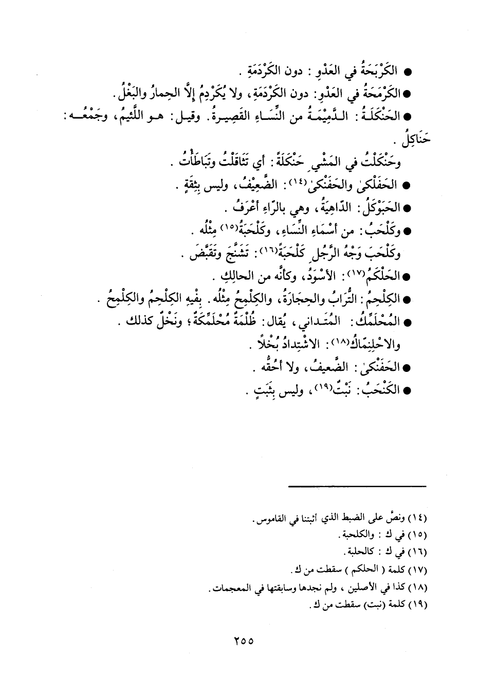 الكَرْبَحَةُ في العَدْوِ : دون الكَرْدَمَةِ . الكَرْمَحَةُ في العَدْوِ : دون الكَرْدَمَةِ ، ولا يُكَرْدِمُ إلاَّ الحِمارُ والبَغْلُ . الحَنْكَلَةُ : الدَّمِيْمَةُ من النِّسَاءِ القَصِيرةُ ، وقيل : هو اللَّئيمُ ، وجَمْعُه : حَنَاكِلُ . وحَنْكَلْتُ في المَشْيِ حَنْكَلَةً : أي تَثَاقَلْتُ وتَبَاطَأُتُ . الحَفَلْكي والحَفَنْكي : الضَّعِيْفُ ، وليس بثِقَةٍ . الحَبَوْكَلُ : الدَّاهِيَةُ ، وهي بالرّاءِ أعْرَفُ . وكَلْحَبُ : من أسْمَاءِ النِّسَاءِ ، وكَلْحَبَةُ مِثْلُه . وكَلْحَبَ وَجْهُ الرَّجُلِ كَلْحَبَةً : تَشَنَّجَ وتَقَبَّضَ . الحَلْكَمُ : الأسْوَدُ ، وكأنَّه من الحالِكِ . الكِلْحِمُ : التُّرَابُ والحِجَارَةُ ، والكِلْمِحُ مِثْلُه ، بفْيهِ الكِلْحِمُ والكِلْمِحُ . المُحْلَمِّكُ : الُمَتداني ، يُقال : ظُلْمَةٌ مُحْلَمِّكَةٌ ، ونَخْلٌ كذلك . والاحْلِنِمّاكُ : الاشْتِدادُ بُخْلاً . الحَفَنْكى : الضَّعيفُ ، ولا أحُقُّه . الكَنْحَبُ : نَبْتٌ ، وليس بِثَبَتٍ .