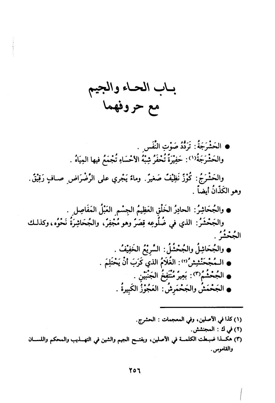 الحَشْرَجَةُ : تَرَدُّدُ صَوْتِ النَّفَسِ . والحَشْرَجَةُ : حَفِيْرَةٌ تُحْفَرُ شِبْهُ الأحْسَاءِ تُجْمَعُ فيها المِيَاهُ . والحَشْرَجُ : كُوْزٌ نَظِيْف صَغيرٌ . وماءٌ يَجْري على الرَّضْرَاضِ صافٍ رَقِيْقٌ . وهو الكَذّانُ أيضاً . والجُحَاشِرُ : الحادِرُ الخَلْقِ العَظِيمُ الجِسْمِ العَبْلُ المَفَاصِل . والجَحْشَرُ : الذي في ضُلُوعِه قِصَرٌ وهو مُجْفِرٌ ، والجُحَاشِرَةُ نَحْوُه ، وكذلك الجُحْشُرُ . والجُحَاشِلُ والجُحْشُلُ : السَّرِيْعُ الخَفِيْفُ . المُجْحَنْشِشُ : الغُلاَمُ الذي كَرَبَ أنْ يَحْتَلِمَ . الجُحْشُمُ : بَعِيرٌ مُنْتَفِخٌ الجَنْبَيْنِ . الجَحْمَشُ والجَحْمَرِشُ : العَجُوْزُ الكَبِيرةُ .
