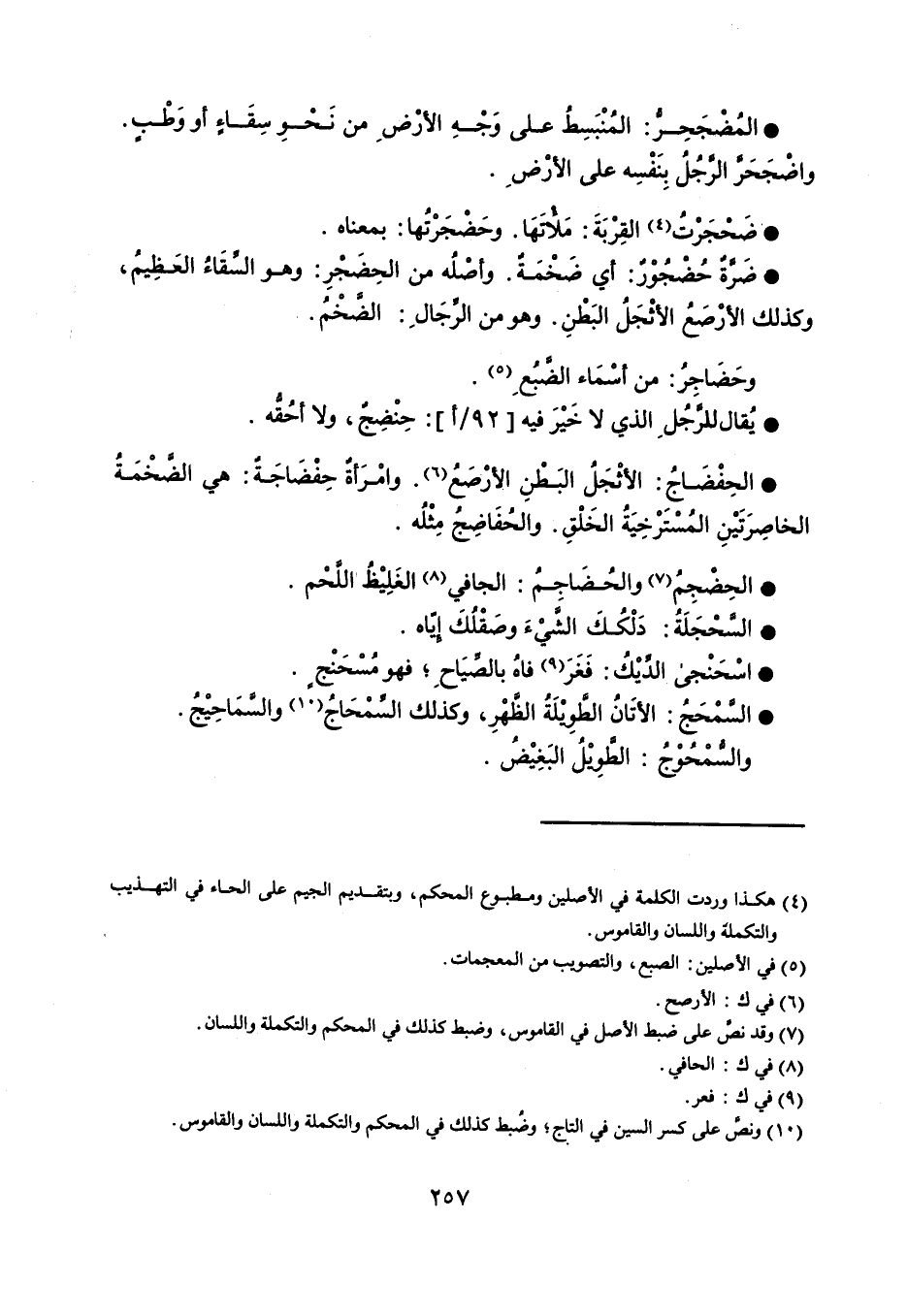 المُضْجَحِرُّ : المُنْبَسِطُ على وَجْهِ الأرْضِ من نَحْوِ سِقَاءٍ أو وَطْبٍ . واضْجَحَرَّ الرَّجُلُ بِنَفْسِه على الأرْضِ . ضَحْجَرْتُ القِرْبَةَ : مَلأُتَهَا . وحَضْجَرْتُها : بمعناه . ضَرَّةٌ حُضْجُوْرٌ : أي ضَخْمَةٌ . وأصْلُه من الحِضَجْرِ : وهو السِّقَاءُ العَظِيمُ ، وكذلك الأرْصَعُ الأثْجَلُ البَطْنِ . وهو من الرِّجَالِ : الضَّخْمُ . وحَضَاجِرُ : من أسْمَاء الضَّبُعِ . يُقال للرَّجُلِ الذي لا خَيْرَ فيه : حِنْضِجٌ ، ولا أحُقُّه . الحِفْضَاجُ : الأثْجَلُ البَطْنِ الأرْصَعُ . وامْرَأةٌ حِفْضَاجَةٌ : هي الضَّخْمَةُ الخاصِرَتَيْنِ المُسْتَرْخِيَةُ الخَلْقِ . والحُفَاضِجُ مِثْلُه . الحِضْجِمُ والحُضَاجِمُ : الحجافي الغَلِيْظُ اللَّحْم . السَّحْجَلَةُ : دَلْكُكَ الشَّيْءَ وصَقْلُكَ إيّاه . اسْحَنْجى الدِّيْكُ : فَغَرَ فاهُ بالصِّيَاحِ ، فهو مُسْحَنْجٍ . السَّمْحَجُ : الأتَانُ الطَّوِيْلَةُ الظَّهْرِ ، وكذلك السِّمْحَاجُ والسَّمَاحِيْجُ . والسُّمْحُوْجُ : الطَّوِيْلُ البَغِبْضُ .