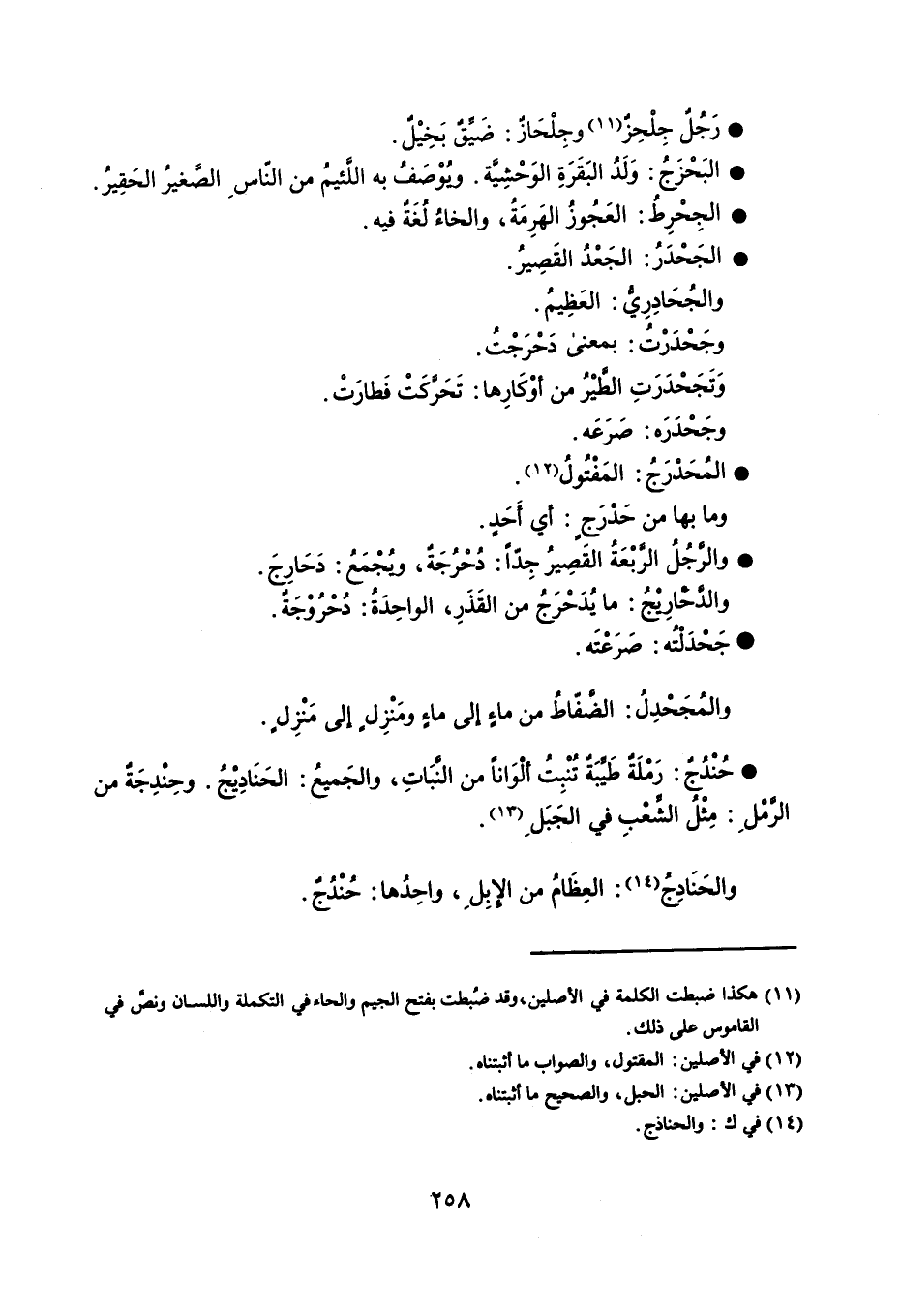 رَجُلٌ جِلْحِزٌ وجِلْحَازٌ : ضَيٌِّ بَخِيْلٌ . البَحْزَجُ : وَلَدُ البَقَرَةِ الوَحْشِيَّة ، وبُوْصَفُ به اللَّئيمُ من النّاسِ الصَّغيرُ الحَقِيرُ . الجِحْرِطُ : العَجُوزُ الهَرِمَةُ ، والخاءُ لُغَةٌ فيه . الجَحْدَرُ : الجَعْدُ القَصِيرُ . والجُحَادِرِيُّ : العَظِيمُ . وجَحَدَرْتُ : بمعنى دَحْرَجْتُ . وَتَجَحْدَرَتِ الطَّيْرُ من أوْكَارِها : تَحَرَّكَتْ فَطارَتْ . وجَحْدَرَه : صَرَعَه . المُحَدْرَجُ : المَفْتُولُ . وما بها من حَدْرَجٍ : أي أَحَدٍ . والرَّجُلُ الرَّبْعَةُ القَصِيرُ جِدّاً : دُحْرُجَةٌ ، ويُجْمَعُ : دَحَارِجَ . والدَّحَارِيْجُ : ما يُدَحْرَجُ من القَذَرِ . الواحِدَةُ : دُحْرُوْجَةٌ . جَحْدَلْتُه : صَرَعْتَه . والمُجَحْدِلُ : الضَّفّاطُ من ماءٍ إلى ماءٍ ومَنْزِلٍ إلى مَنْزِلٍ . حُنْدُجٌ : رَمْلَةٌ طَيِّبَةٌ تُنْبِتُ ألْوَاناً من النَّبَاتِ ، والجَميعُ : الحَنَادِيْجُ ، وحِنْدِجَةٌ من الرَّمْلِ : مِثْلُ الشَّعْبِ في الجَبَلِ . والحَنَادِجُ : العِظَامُ من الإبِلِ ، واحِدُها : حُنْدُجٌ .