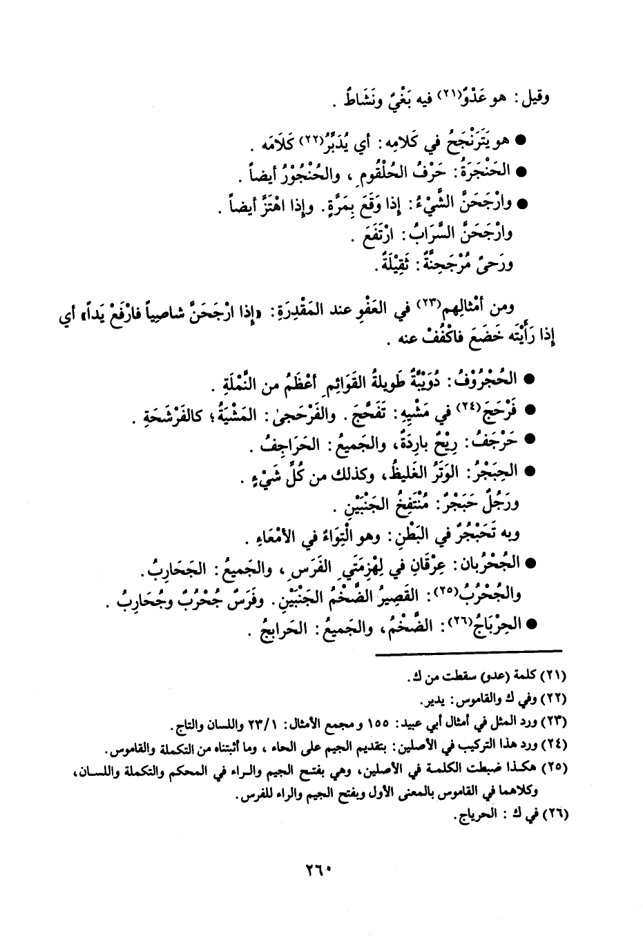 وقيل : هو عَدْوٌ فيه بَغْيٌ ونَشَاطٌ . هو يَتَرَنْجَحُ في كَلامِه : أي يُدَبِّرُ كَلاَمَه . الحَنْجَرَةُ : حَرْفُ الحُلْقُومِ ، والحُنْجُوْرُ أيضاً . وارْجَحَنَّ الشَّيْءُ : إذا وَقَعَ بِمَرَّةٍ ، وإذا اهْتَزَّ أيضاً . وارْجَحَنَّ السَّرَابُ : ارْتَفَعَ . ورَحىً مُرْجَحِنَّةٌ : ثَقِيْلَةٌ . ومن أمثالهم في العَفْوِ عند المَقْدِرَةِ : ' إذا ارْجَحَنَّ شاصِياً فارْفَعْ يَداً أي إذا رَأَيْتَه خَضَعَ فاكْفُفْ عنه . الحُجْرُوْفُ : دُوَيْبَّةٌ طَويلةُ القَوَائِمِ أعْظَمُ من النَّمْلَةِ . فَرْجَحَ في مَشْيِهِ : تَفَحَّجَ . والفَرْحَجى : المَشْيَةُ ؛ كالفَرْشَحَةِ . حَرْجَفُ : رِيْحٌ بارِدَةٌ ، والجَميعُ : الحَرَاجِفُ . الحِبَجْرُ : الوَتَرُ الغَليظُ ، وكذلك من كُلِّ شَيْءٍ . ورَجُلٌ حَبَجْرٌ : مُنْتَفِخٌ الجَنْبَيْنِ . وبه تَحَبْجُرٌ في البَطْنِ : وهو الْتِوَاءٌ في الأمْعَاءِ . الجُحْرُبان : عِرْقَانِ في لِهْزِمَتَيِ الفَرَسِ ، والجَميعُ : الجَحَارِبُ . والجُحْرُبُ : القَصِيرُ الضَّخْمُ الجَنْبَيْنِ . وفَرَسٌ جُحْرُبٌ وجُحَارِبُ . الحِرْبَاجُ : الضَّخْمُ ، والجَميعُ : الحَرابجُ .