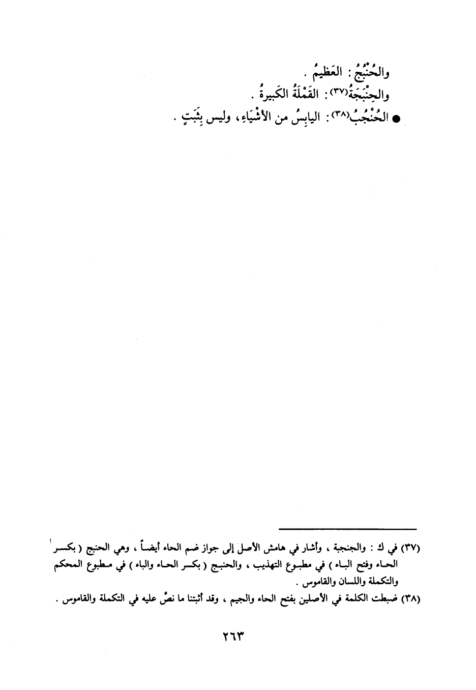 والحُنْبُجُ : العَظيمُ . والحِنْبَجَةُ : القَمْلَةُ الكَبيرةُ . الحُنْجُبُ : اليابِسُ من الأشْيَاءِ ، وليس بِثَبَتٍ .