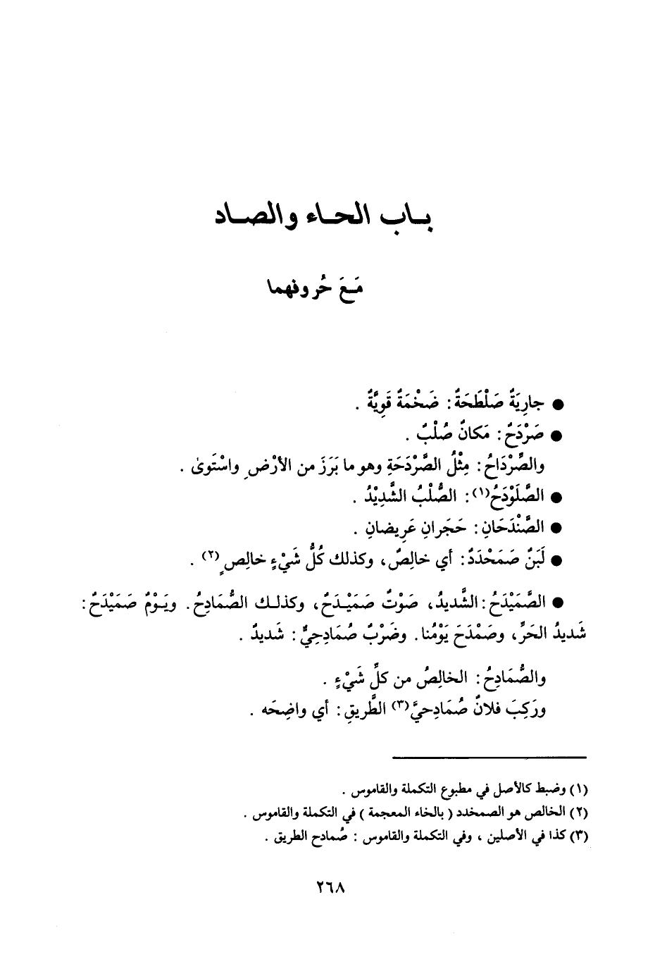 جارِيَةٌ صَلْطَحَةٌ : ضَخْمَةٌ قَوِيَّةٌ . صَرْدَحٌ : مَكانٌ صُلْبٌ . والصِّرْدَاحُ : مِثْلُ الصَّرْدَحَةِ وهو ما بَرَزَ من الأرْضِ واسْتَوى . الصَّلَوْدَحُ : الصُّلْبُ الشَّدِيْدُ . الصَّنْدَحَانِ : حَجَرانِ عَرِيضانِ . لَبَنٌ صَمَحْدَدٌ : أي خالِصٌ ، وذكلك كُلُّ شَيْءٍ خالِصٍ . الصَّمَيْدَحُ : الشَّديدُ ، صَوْتٌ صَمَيْدَحٌ ، وكذلك الصُّمَادِحُ ، ويَوْمٌ صَمَيْدَحٌ : شَديدُ الحَرِّ ، وصَمْدَحَ يَوْمُنا ، وضَرْبٌ صُمَلدِحِيٌّ : شَديدٌ . والصُّمَادِحُ : الخالِصُ من كلِّ شَيْءٍ . ورَكِبَ فلانٌ صُمَادِحيَّ الطَّريقِ : أي واضِحَه .